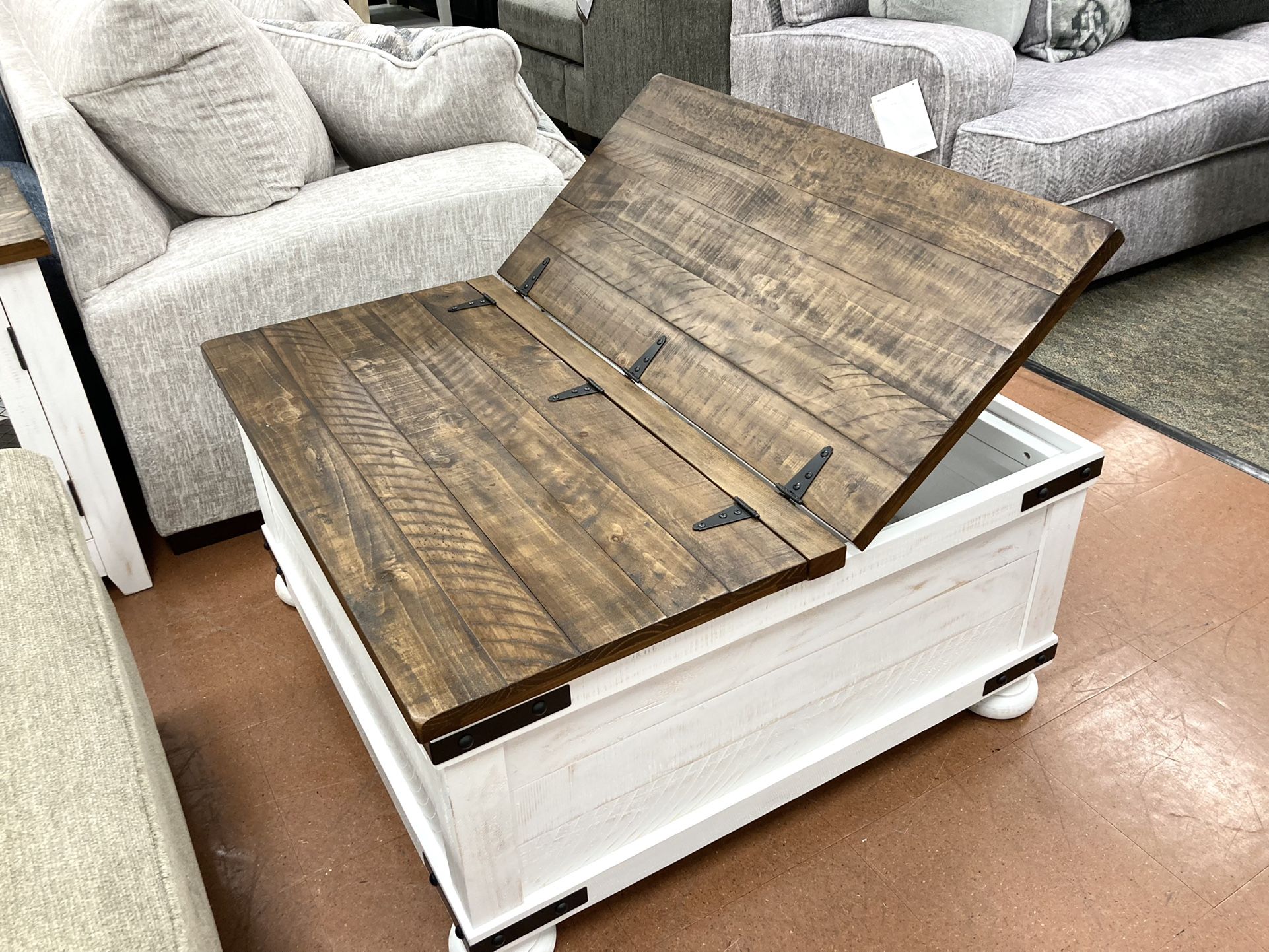 New Storage Coffee Table - $429 Distressed White / Brown Finish In Stock - Take it Home Today!! Rock’s Carolina Furniture 2356 Virginia Beach Blvd Virginia Beach, VA 23454 (next to TJ Maxx @ London Bridge) Open 10 to 7 Monday - Saturday Open 10 to 5 Sunday