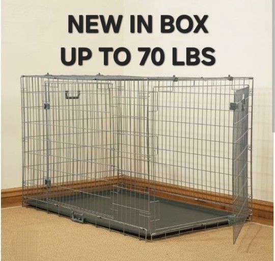 New in box! 36"x25"x23" l'xl dog crate 2 doors, includes easy slide and clean floor tray Folds flat convenient storage and transportation. Up to 70 lbs animal cage All sizes available