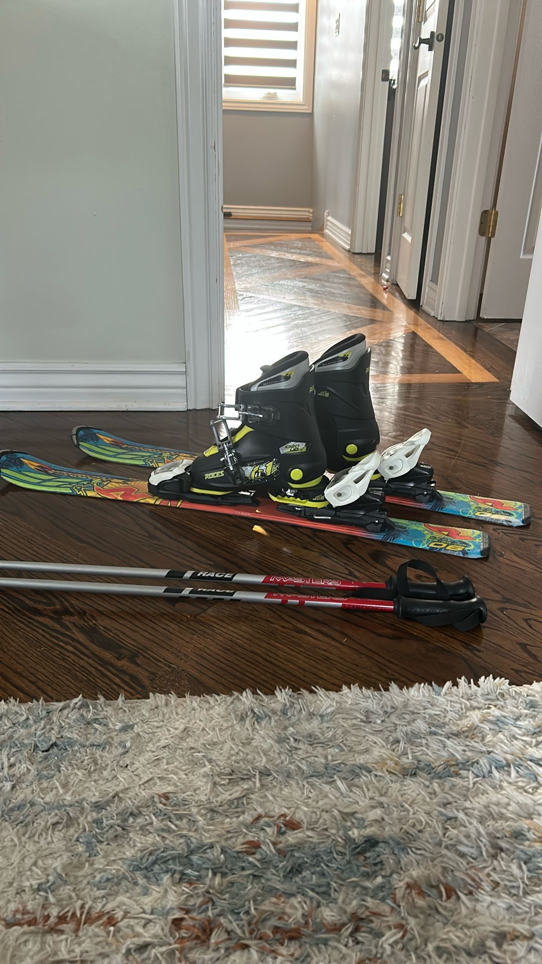 For sale ski set including Nordica 90 skis, ski poles and brand new Roces adjustable boots size 12 to 2. Good for young child between 4 and 6 years old. Can separate.