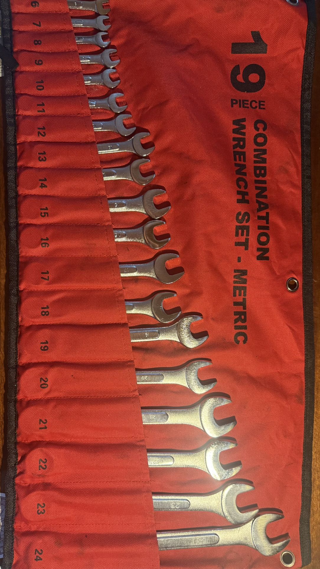 19 piece combination wrench set. roll up and tie to keep secure