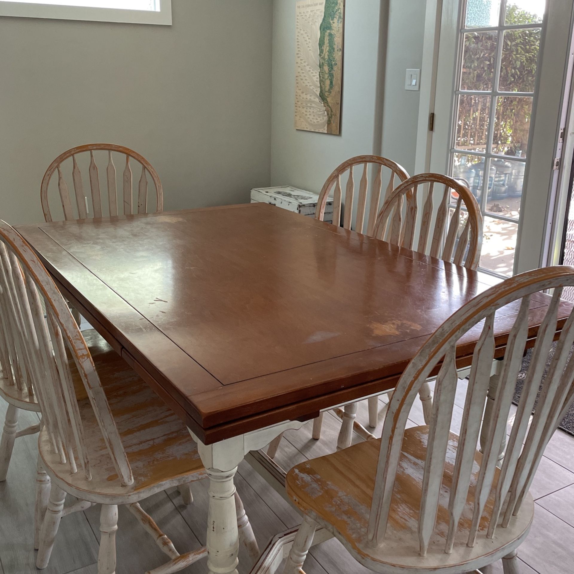 Solid wood table and 6 chairs 62” x 40 and extends in a snap to 94” It’ll be your Christmas present. Made by Cal Shops, the chalk paint was added about 10 years ago. It needs to be refinished. You pick up.