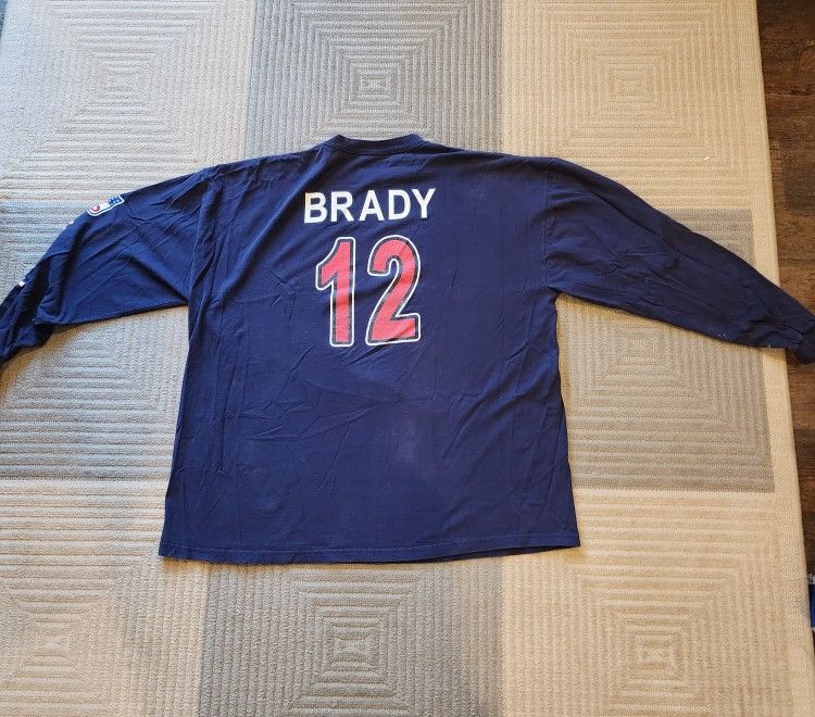 New England Patriots Double Sided Tom Brady Long Sleeve Official NFL Shirt 3XL . Measures shoulder to shoulder 29 inches, sleeve length 25 inches, under armpit to armpit 29 inches, back of neck to bottom of shirt 33 inches. Not sure who made this shirt tag is worn, SEE PICTURES. There is writing down the left sleeve, SEE PICTURES. There ate white spots on bottom of white sleeve, SEE PICTURES. Slight fading. No holes or rips. PLEASE CLOSELY LOOK AT ALL OF THE PICTURES AND ZOOM IN SO YOU CAN DECIDE THE CONDITION FOR YOURSELF BEFORE BUYING.