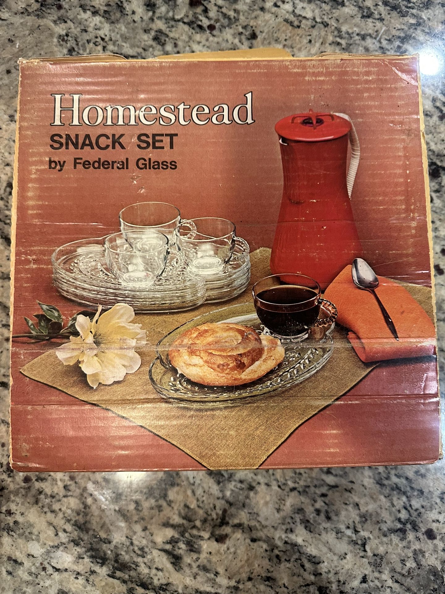 Vintage Federal Glass SNACK SET HOMESTEAD 4 Plates 4 Cups Glassware Set New
