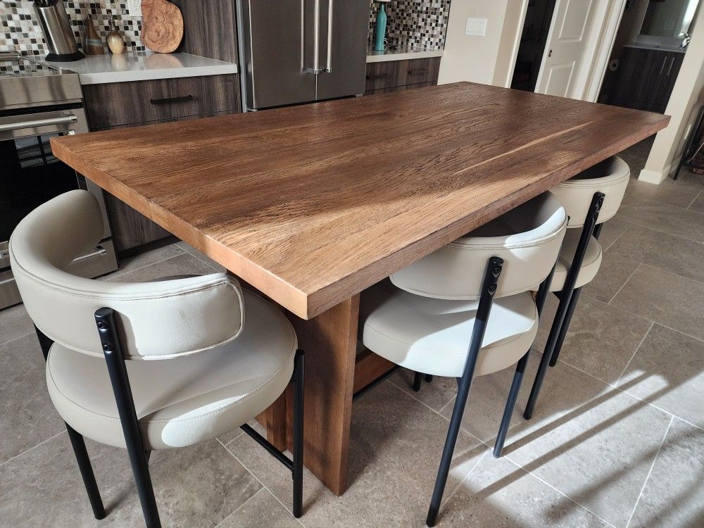 Solid oak Pottery Barn counter height table and four chairs. Details in images. Table top has slight wear and could use a light sanding and re-sealed. Otherwise, it's very solid and heavy. I have disassembled the top from the base for easy moving, but it will take two (2) people to move. Chairs are from Wayfair. Good shape, faux leather. One chair has a slight stain that could be easily cleaned. Sold as a set for $400. Venmo preferred, but Cash ok. I don't have Zelle. You must pickup / No Delivery. Sunnyslope area.