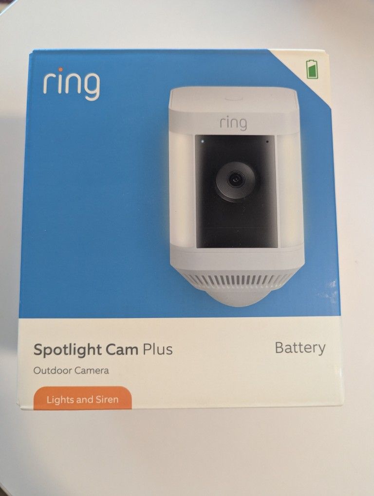 THREE - Ring Spotlight Cam Plus, Battery | Home or business security with HD video, Two-Way Talk, Color Night Vision, and Security Siren (2022 release) - White BRAND NEW IN BOX See, hear and speak to on camera Quick release Battery pack.