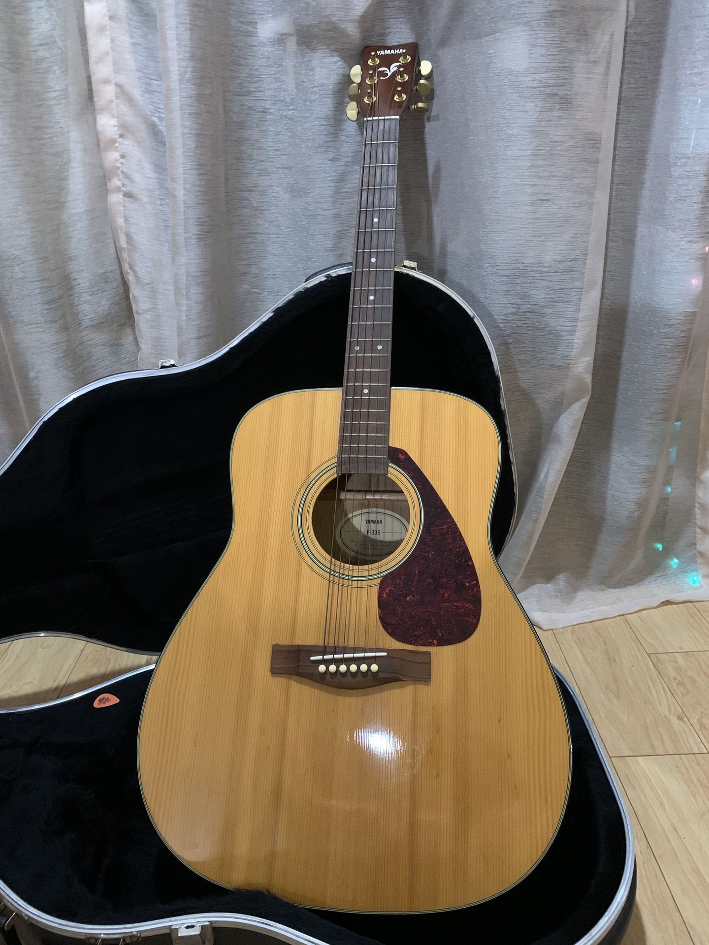 Yamaha F-335 Acoustic Guitar, natural finish with hard case and accessories. Chromatic tuner works (as shown in photo) but will need 2 AAA batteries. Also comes with leather strap, chord guide, and several picks The Yamaha F335 is a popular dreadnought-style acoustic guitar known for its spruce top and nato back and sides, offering a balanced tone suitable for various musical genres. It features a rosewood fingerboard and bridge, and a tortoiseshell pickguard, contributing to its classic aesthetic. This model is often recommended as a reliable and affordable option for those starting their musical journey.