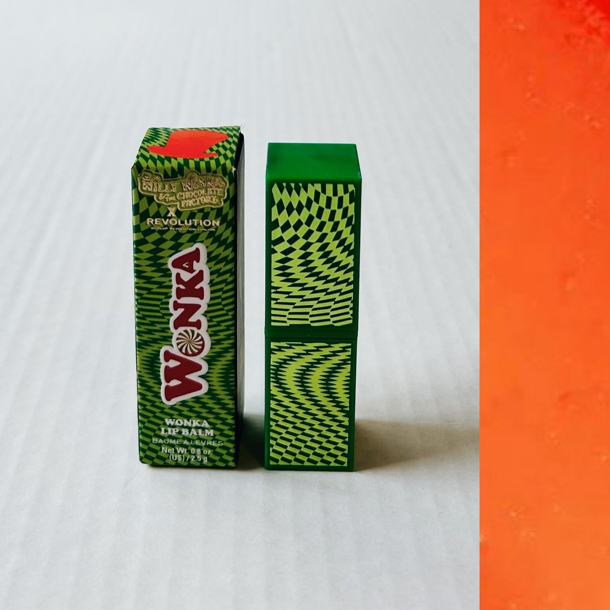 Brand New in Box Revolution x Willy Wonka Lip Balm! * Item only taken out of box for photos. * Feast your eyes on Willy Wonka & the Chocolate Factory x Revolution, a deliciously colourful collection of sweetly-scented cosmetics and accessories! Give your lips a fruity treat with this lip balm, a hydrating formula that applies clear and is finished with a yummy tropical mango scent. Cruelty-free and vegan.