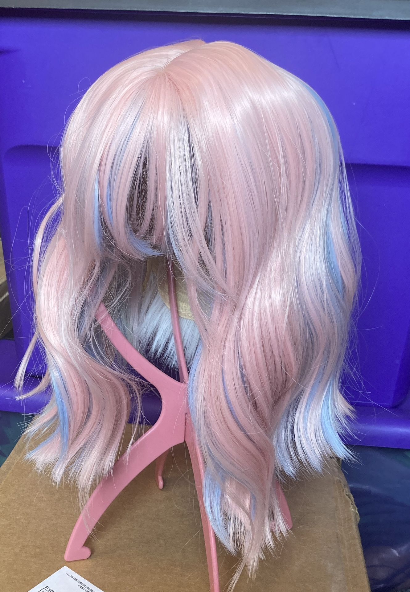 Blonde, light blue and light pink wavy wig with bangs. Trans pride colors (ish)