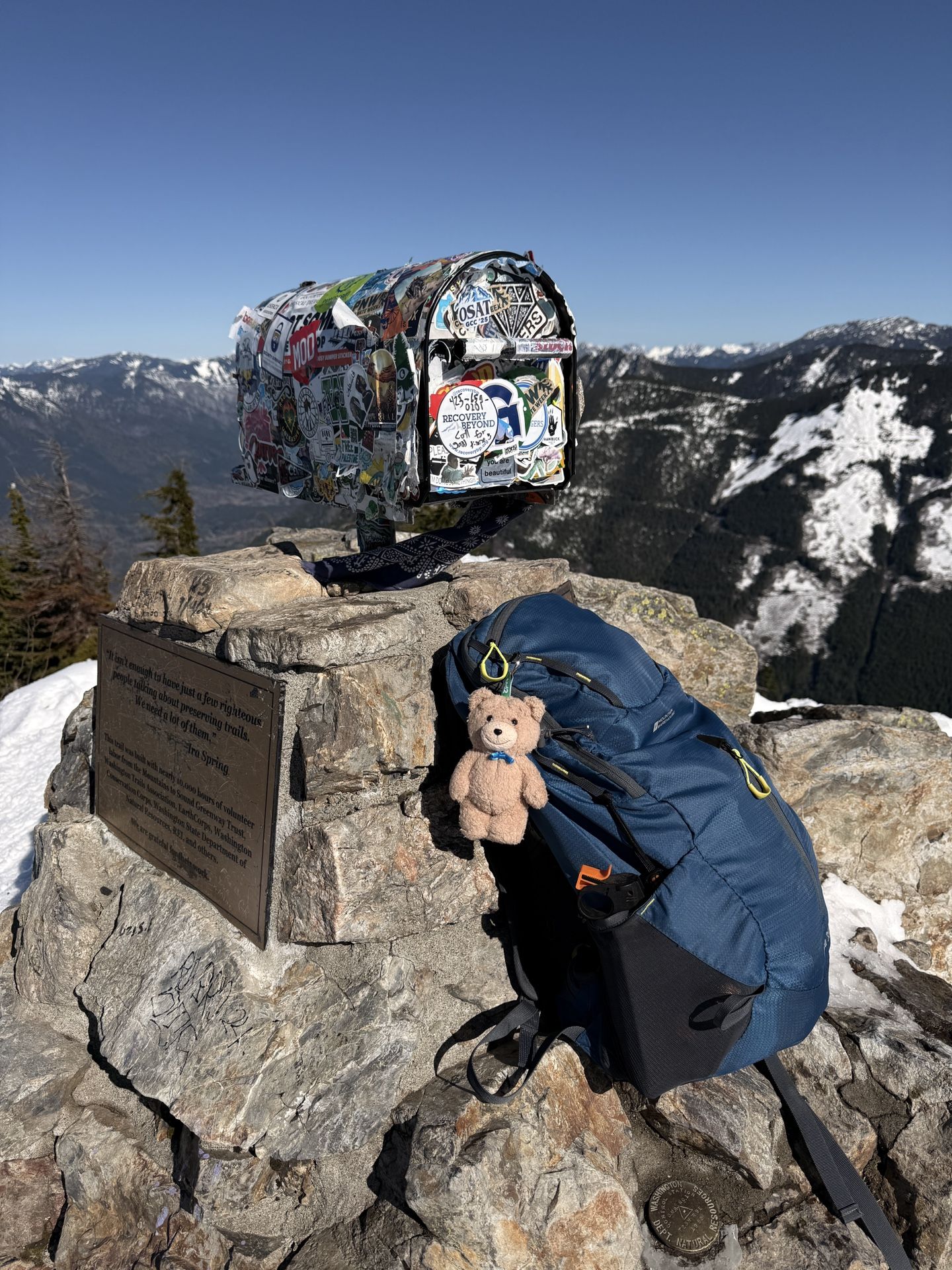 Mountain warehouse Inca 38L blue backpack, perfect size for day hikes, excellent conditions, picture shows the backpack on Mailbox peak, teddy bear not included.