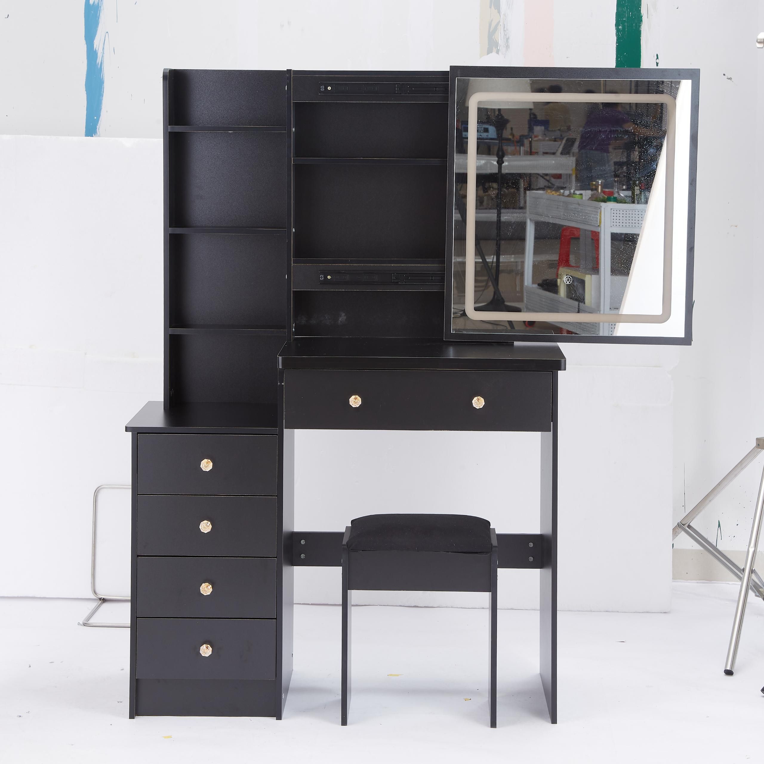 37 Middle Size Left Bedside Cabinet Vanity Table + Cushioned Stool, Large Sliding, Touch Control, Tri-color Switching, Brightness Adjust LED Mirror, H