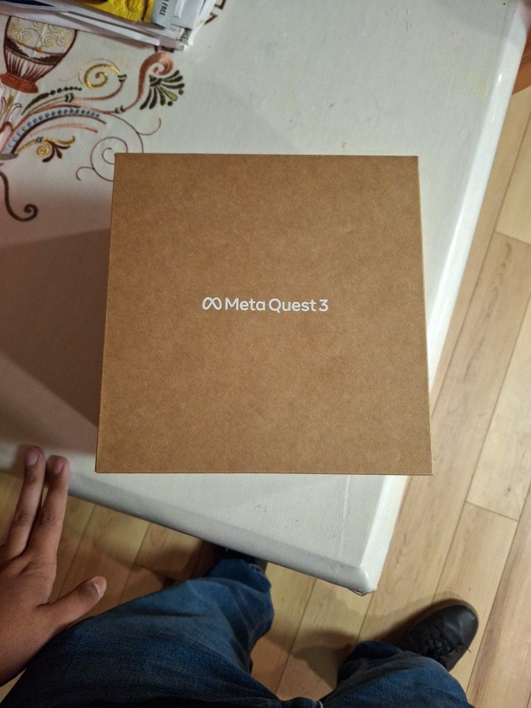 A Meta Quest headset, used, but in pristine condition. The main headset, both controllers, batteries, and a USB-C charger is included.
