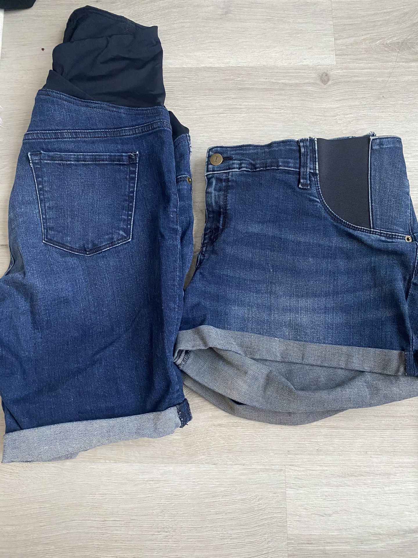 Maternity jean shorts. Great condition. The one to the left are just above knee length sand the one on the right are shorter regular length shorts. $10 each or both for $15.