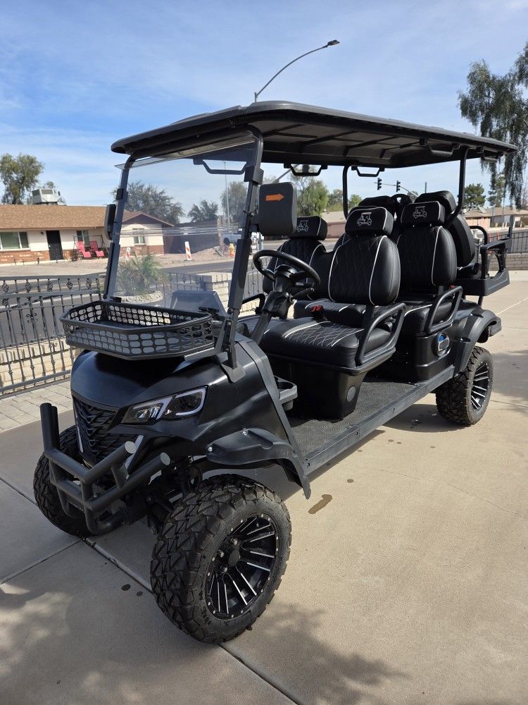 2024 Rebel Golf cart 6 seater, clean title, 550 Miles, drives great, does 30mph, 72 volt lithium battery, lifted, backup camera, Bluetooth, price is firm, no trades. Street legal.