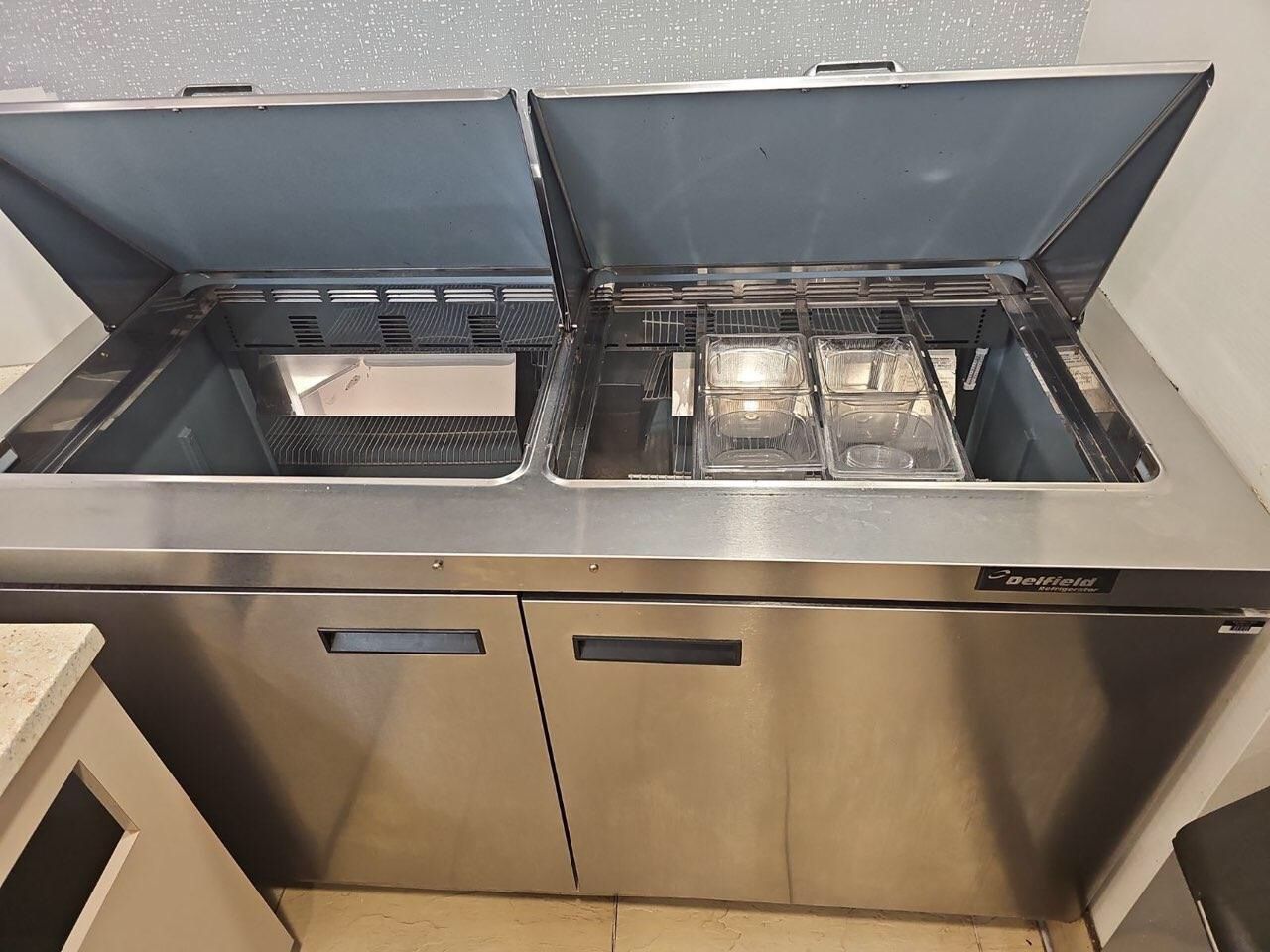 Delfield Front Refrigerator and prep table. In good condition. With a top capacity of up to 12 pans and a generous workspace in front of the rail, the Delfield 4448NP-12 48" salad prep refrigerator provides plenty of space to store ingredients and prepare your signature salads or sandwiches. Its dual level pan brackets allow you to set the pans 1" lower than normal if needed, for maximum cooling performance even in high temperatures, or if the cover is usually left open. A dishwasher safe 8" wide cutting board on the front provides plenty of room for sandwich or salad preparation. To keep backup ingredients close at hand, the lower section boasts two adjustable epoxy coated wire shelves for flexible storage, giving you 16 cu. ft. of storage space, so you'll always have the toppings you need close at hand. Plus, its air screen makes sure your product will stay cold, but not dry out. Its 1/5 hp compressor uses environmentally friendly R290 refrigerant to maintain food safe holding temperatures. High density foamed in place polyurethane insulation, Delfield's precision ACT electronic temperature controls, and a unique evaporator design that provides optimum airflow also contribute to outstanding temperature retention and efficiency in the most demanding environments. This unit's front breathing design allows for zero-clearance installation in tight spaces, and 3" casters enable easy movement for cleaning. It requires a 115V electrical connection. Overall Dimensions: Width: 48 1/8" Depth: 31 1/2" Height: 40 1/8" Work Surface Height: 34" Capacity: 16 cu. ft.