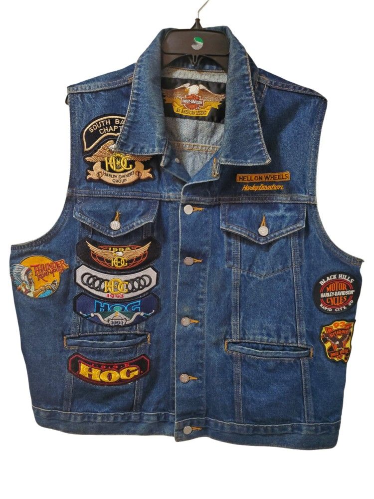 Vintage Harley Davidson Denim Vest With Rare Patches, Made In USA Sz XL, Great Condition, Harley Owners Group