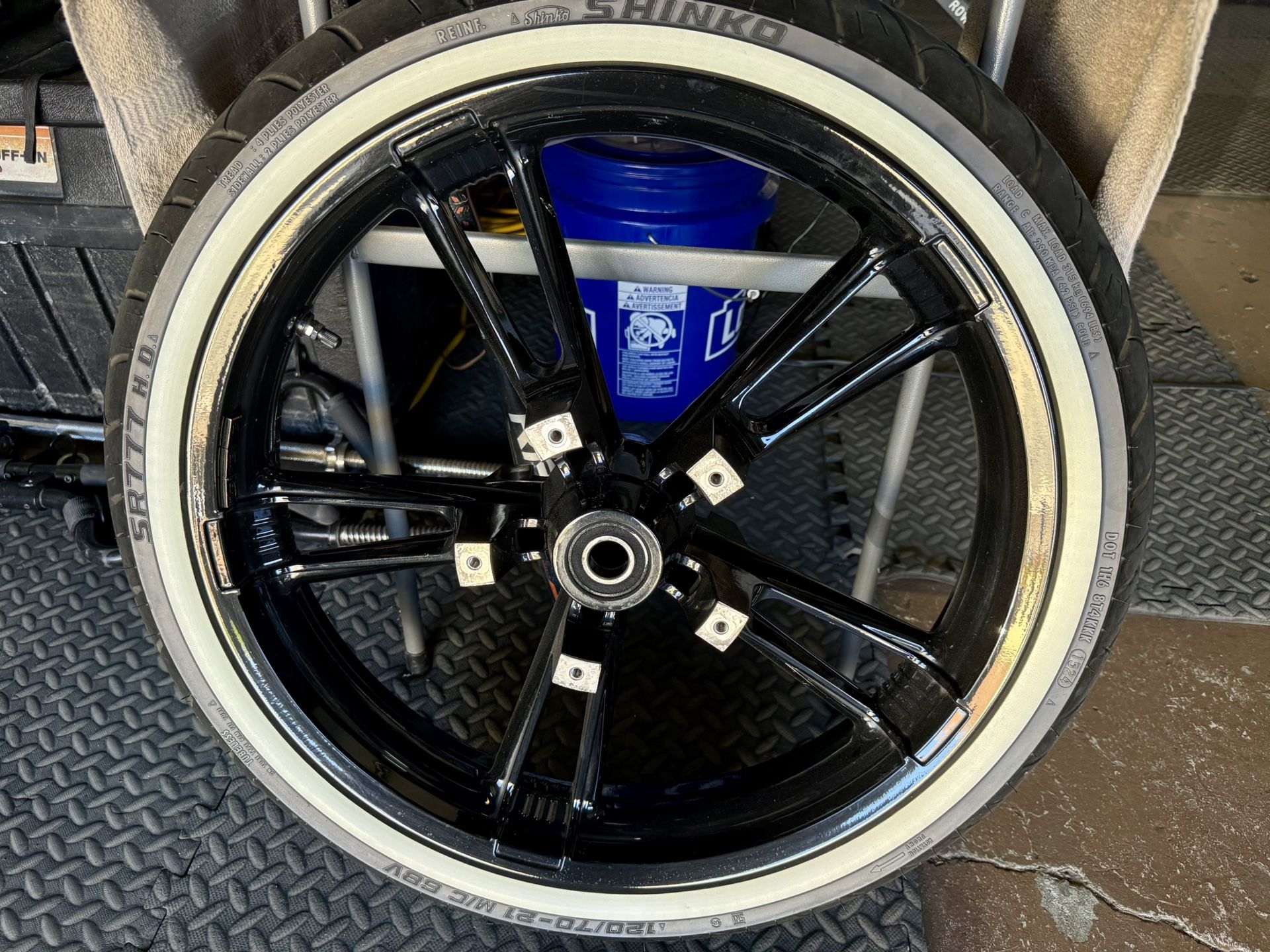 21 inch Harley front enforcer off of a 2019 RK, wheel powder coated black with Shinko white wall tire size 120/70/21. Tire still in good condition with 85% tread left, rim in good condition and balanced.
