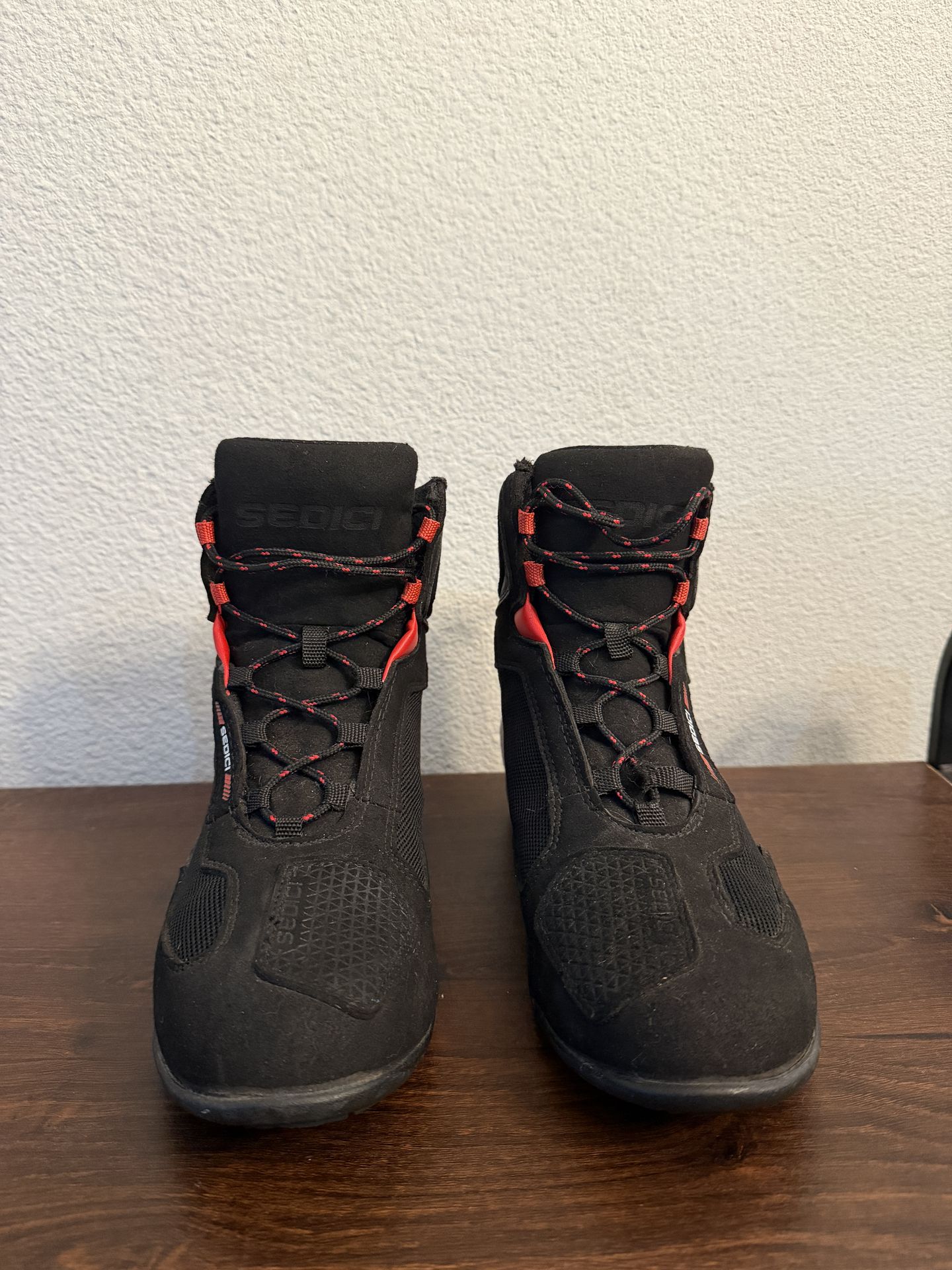 Unisex. Men's 8 but can fit a men's 8.5! I currently wear a men's 8.5/ womens 10 and these fit. I only wore these for a month before my new boots came in. Don't need anymore. Only issue is the end loop on the right shoe came off as in the photos but doesn't affect the protection or lacing up! Can easily be fix don't have the time to do it. Good condition needs a light wipe down but other than that good condition. SEDICI Sportiva Riding Shoes men's 8 / Euro 41 Motorcycle riding shoes. Have mesh for warm weather riding and over above the ankle protection. These are unisex mainly sized in men's 8 but can fit a men's 8.5/ women's 10. you can try them on if you'll like. Asking 50$ obo or even trade! looking for another riding jacket