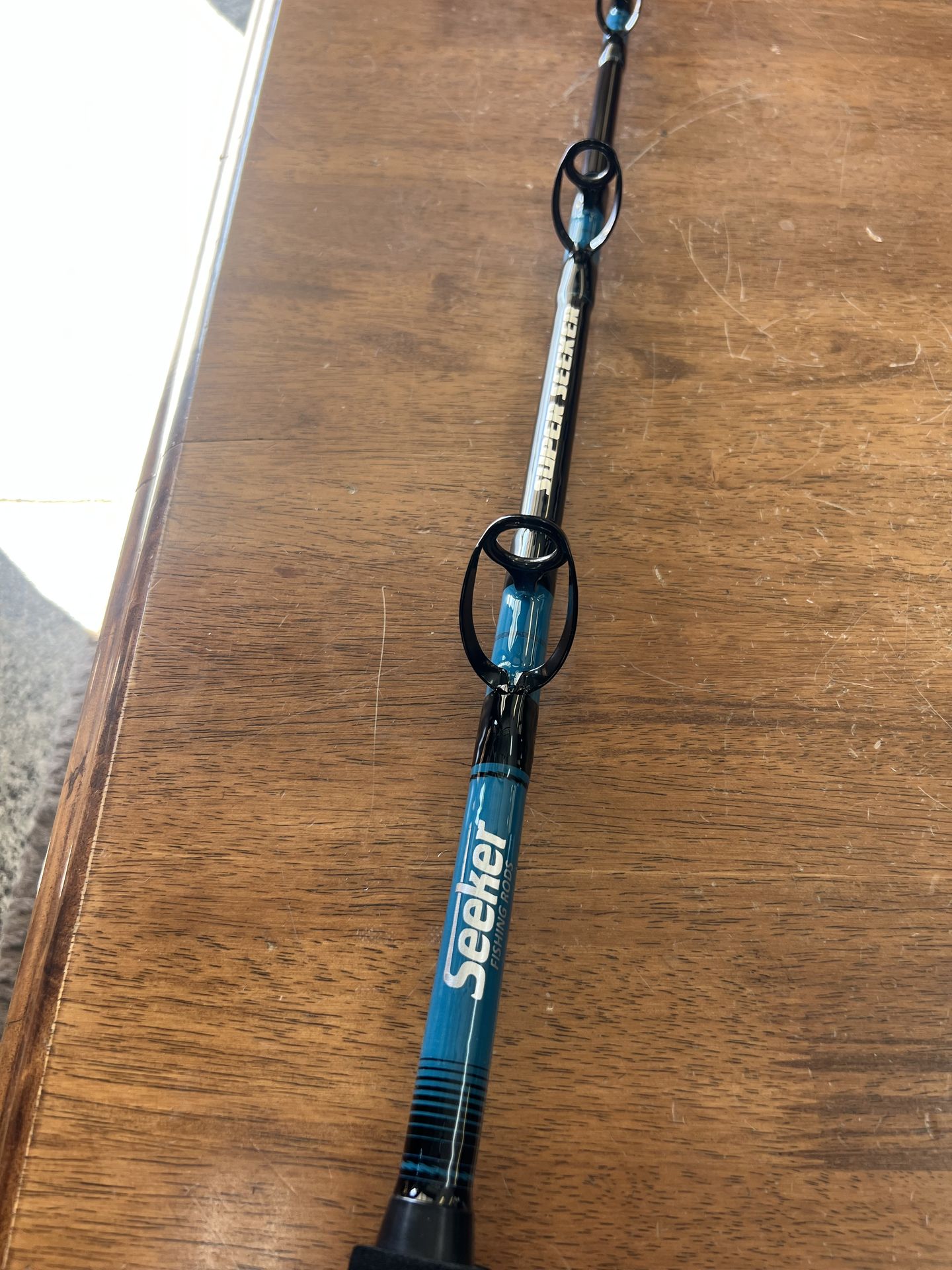 This is a brand new Super Seeker that I custom wrapped . Model is a 1 x 3 Rail Rod . It’s uncut and measures 7’3” long . A factory wrapped 1 X 3 is 7’ . I kept it a little longer like an OSP . It’s rated 60-100 pound . Has E4 grips front grip is 18” long . Rear grip is 14.5” with the butt cap . All alps aluminum reel seat , all alps guides and tip . These are expensive builds . A factory wrapped super seeker 1x3 is $759 plus tax . Selling this one for much less and it’s brand new just off the rod dryer . Located in Fontana for pick up .