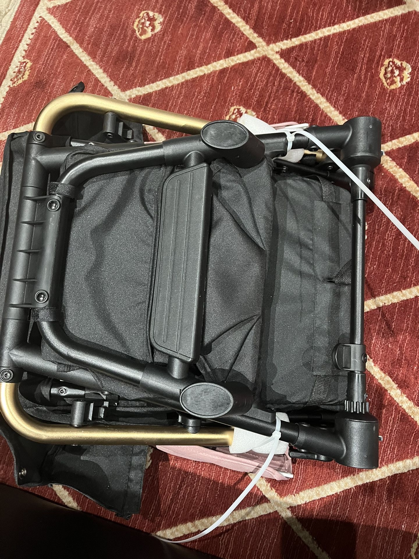 A small folded chair on wheels that a baby sits in. It is a pink and black stroller. That hasn’t been used. Very reliable.
