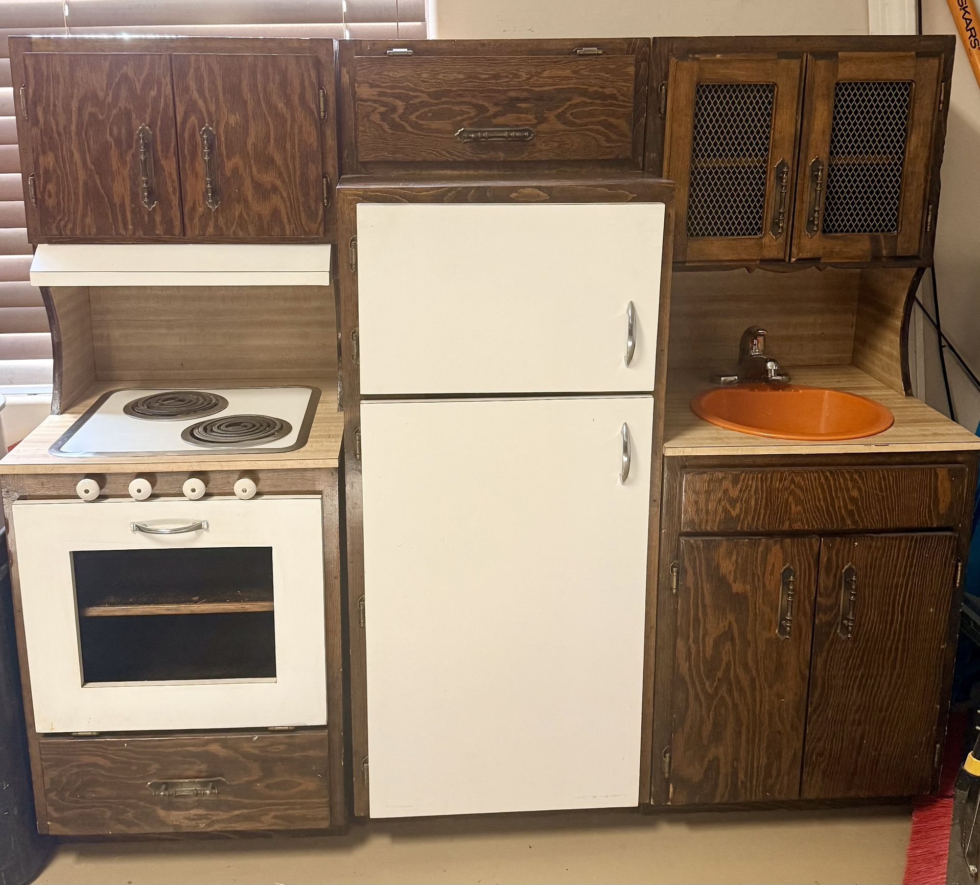 This was mine from the 1970’s. My dad built it for me as he was a custom cabinet maker. It was so much fun to play with. I hold on to it because it has so many memories but it needs to be shared with other kids to enjoy. It is 56” tall and 5 ft when all three pieces are side by side.