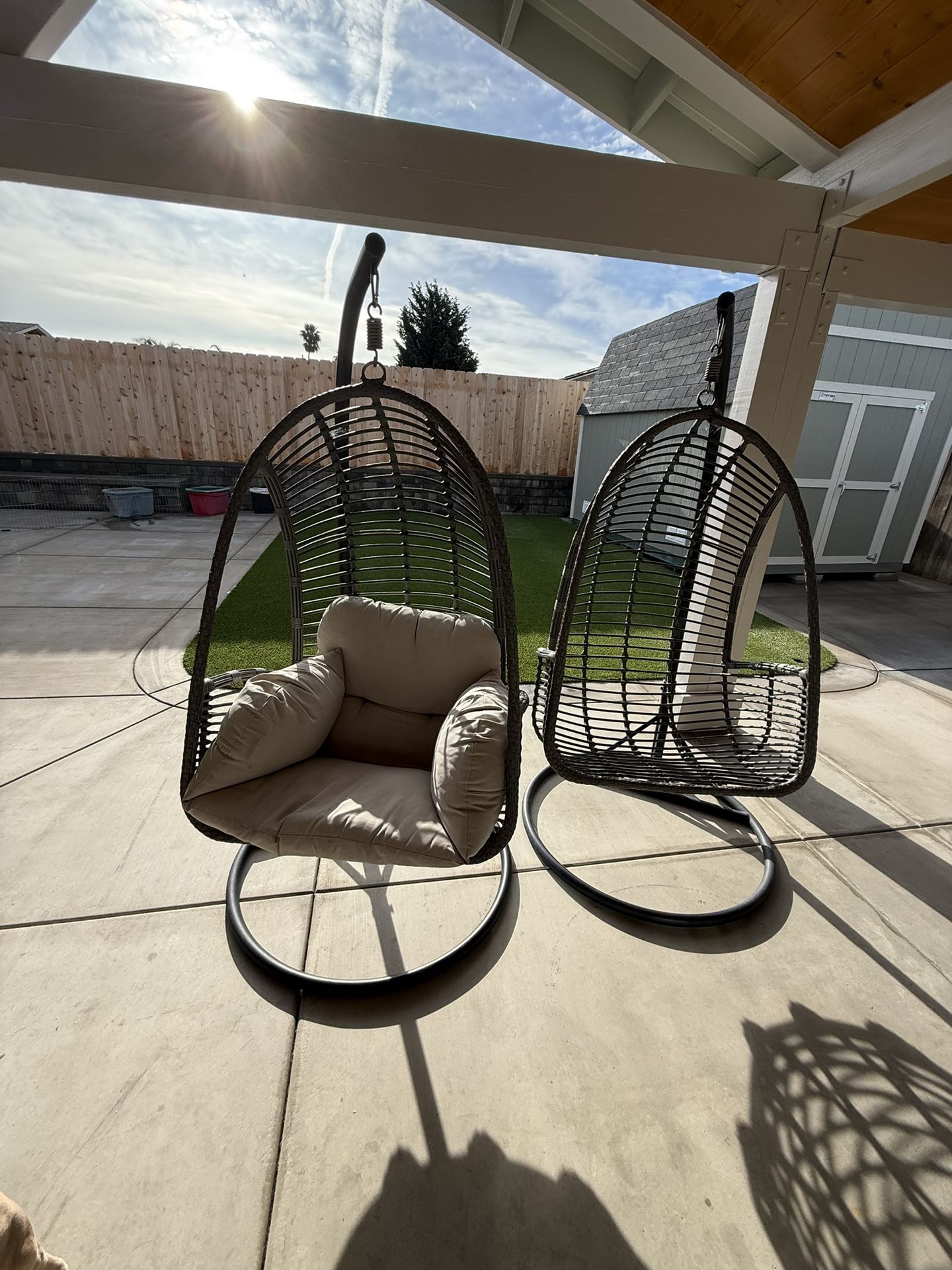 2 Egg style backyard lounge chairs from Jerome’s. Bought in the beginning of Covid. Does need new cushions, and have a little bit of rust on springs from outdoor conditions, but other than that they are in great condition and are very loved when hosting, only selling them as we are getting new outdoor furniture. $250 obo