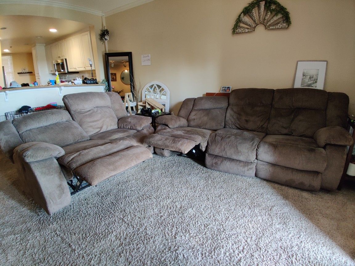 I have a pair of Ashley Furniture couches that I'm looking to sell. Both in good condition with no spills or stains. Each couch has electronic reclining left and right seats that also feature USB ports. The reclining seats are nearly lay flat as well. The middle seat cushion cover of the large sofa was replaced due to a tear when we got it. The heam lines Simon the backs are also finicky and have slowly been merging into just one large section on a few of the backs. Been a great pair of couches for movie nights. Looking for $700 for the pair but am open to separate sales for each
