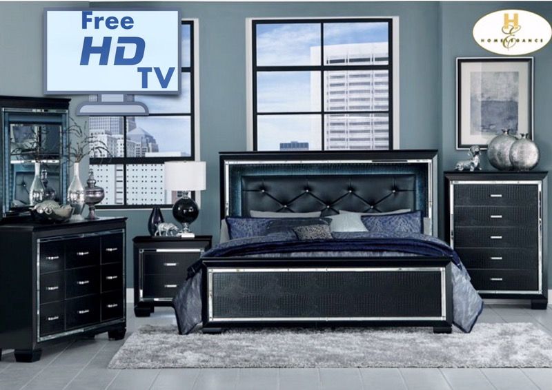 Includes Queen Bed , Dresser and Mirror , 1 NS 1 chest . $3194 dlls with mattress Glamour reigns in the design of the Allura Collection. Framing each piece is a decorative beveled mirror accent that enhances the illumination from the touch-engaged LED back-light of the headboard and mirror, as well as the under-light of the night stand. Alligator embossing and high polished crystal-enhanced hardware boldly accent the available silver or black finish of the collection. LED lighting framing headboard and mirror Faux alligator embossed front panel Black bi-cast vinyl headboard Allura Collection Contemporary Style Black Finish Dovetailed Drawer Ball Bearing Side Glide Queen Bed, LED Lighting HB: 59.75H FB: 26.25H Night Stand, LED Lighting 28 x 17 x 28H Dresser 63.75 x 17 x 39H Mirror, LED Lighting 47.25 x 1.5 x 38H Chest 38 x 17 x 51H