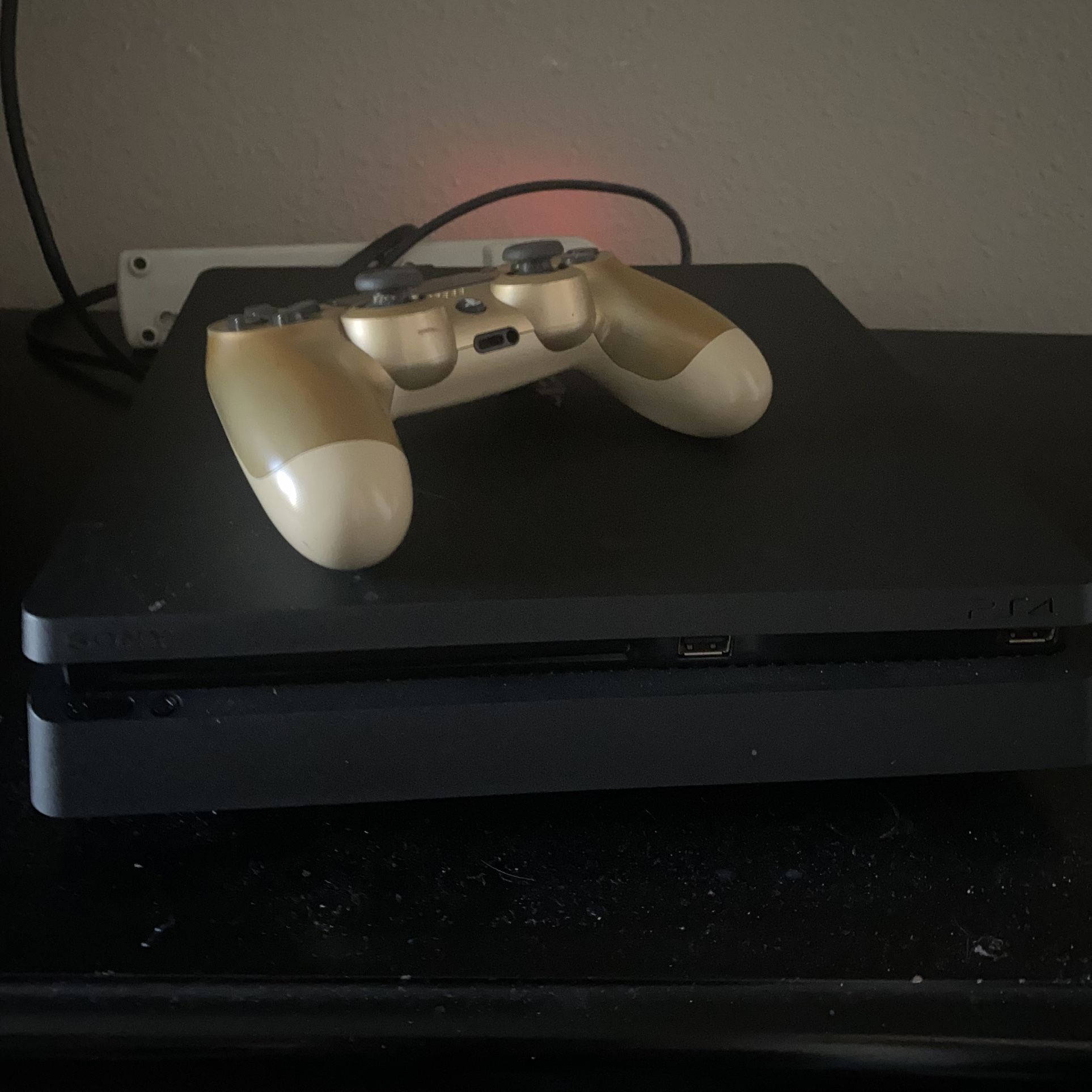 Ps4 slim and gold controller, 1 TB of storage, used. Cleaned the outside and inside, and is quieter than a jet engine. Works well, has been working for quite a while. No issues when booting up or performing. Exact change required.