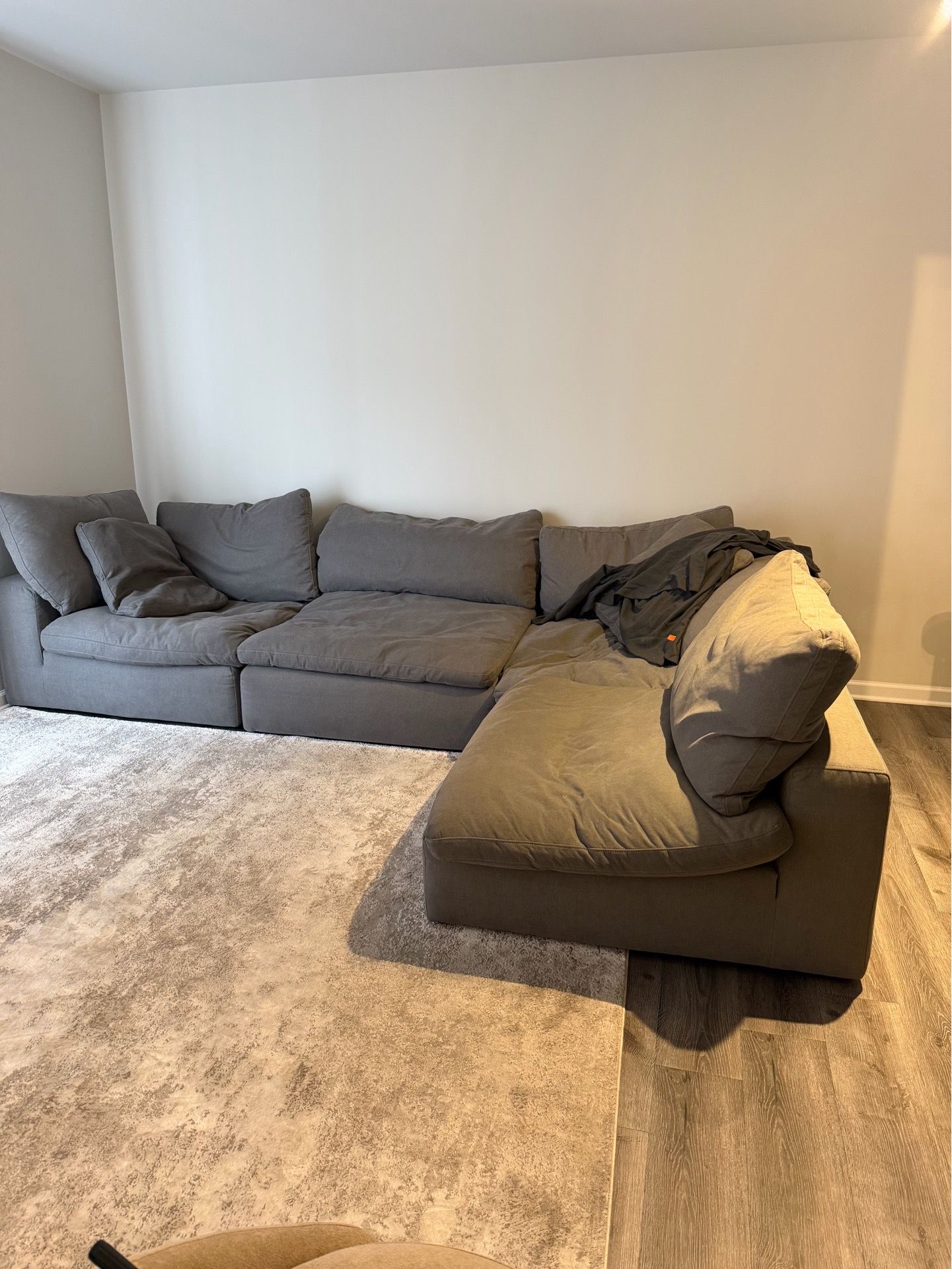 Dark Grey Cloud Sectional – Value City Furniture Super comfortable dark grey cloud-style sectional from Value City Furniture. This couch is known for its deep, plush seating and soft, relaxed feel—perfect for lounging. 🛋️ Details: • Color: Dark Grey • Brand: Value City Furniture • Width: 110 inches • Depth: approx. 35–40 inches • Back Height: approx. 28–34 inches • Filling: Down/feather blend cushions (cloud-style for extra softness) The cushions are oversized and filled with a feather/down blend, giving it that “sink-in” cloud couch feel while still providing support. Great condition overall. Perfect for a modern, cozy living room setup. Message me if interested!
