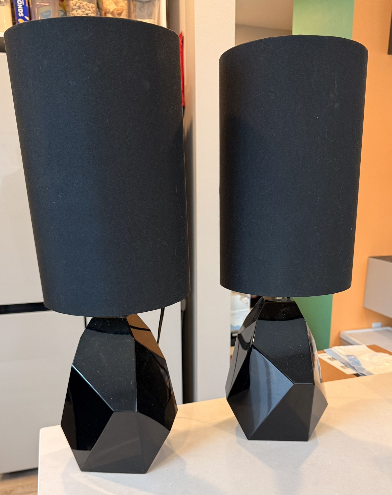 Pair of modern table lamps, perfect condition. From West Elm. Base is lacquered. Measure 24” tall x 9” across.