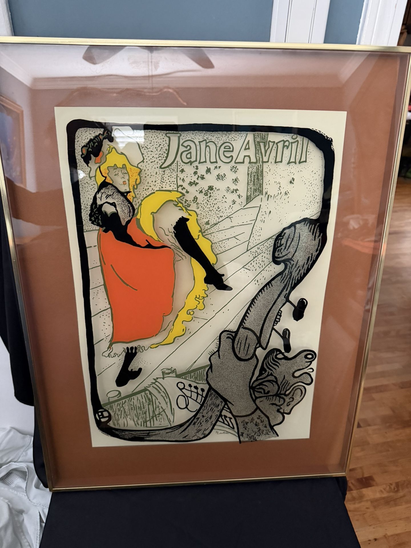 Reproduction Of "Jane Avril" Henri de Toulouse-Lautrec. Image Is A Shadow Box Painted On Glass. Heavy. Approx. 20” Wide by 26” Tall. Good Condition. R-Blue