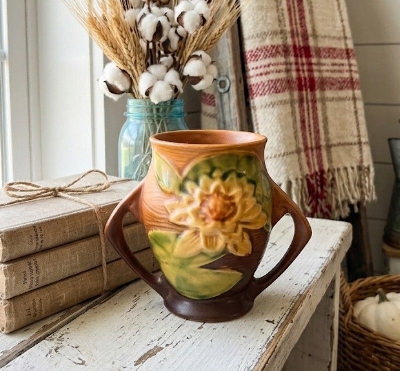 Add a touch of 1940s American craftsmanship to your home with this stunning Roseville Pottery Water Lily vase. Produced in 1943, the Water Lily line is celebrated for its bold, sculptural floral motifs and distinctive "twig" style handles that epitomize the late Art Deco and Arts & Crafts movement. This specific piece (Shape 71-4) features a beautiful gradient "Brown/Autumn" glaze, transitioning from a deep cocoa base to a warm terracotta rim. The embossed water lily blossoms are exceptionally crisp, accented by vibrant green lily pads against a textured, wood-grain background. Brand: Roseville Pottery (Zanesville, Ohio) Pattern: Water Lily (Introduced 1943) Shape No: 71-4" Color: Brown / Autumn / Tan Dimensions: Approx. 4" Tall x 6" Wide (Handle to Handle) Markings: Authentic raised "Roseville U.S.A. 71-4" on the base. This vase is in Very Good vintage condition. No noticed chips, cracks, or repairs to the rim, base, or delicate handles. Colors are bright and even with excellent glaze coverage. Fine age-appropriate minor crazing may be present (typical of Roseville pottery of this era) but does not detract from the beauty or structural integrity of the piece. The interior is clean and free of heavy mineral deposits. 89th avenue and Cactus #RosevillePottery #WaterLilyVase #MidCenturyDecor #ArtDecoPottery #AntiqueFlowerUrn #1943Collectible #ZanesvilleOhio #ArtsAndCraftsMovement #BrownRoseville #VintageUrn #AmericanArtPottery #AntiqueCollector #RareFind #CottagecoreDecor #71-4Vase #HomeDecor #PotteryLove #EstateFind