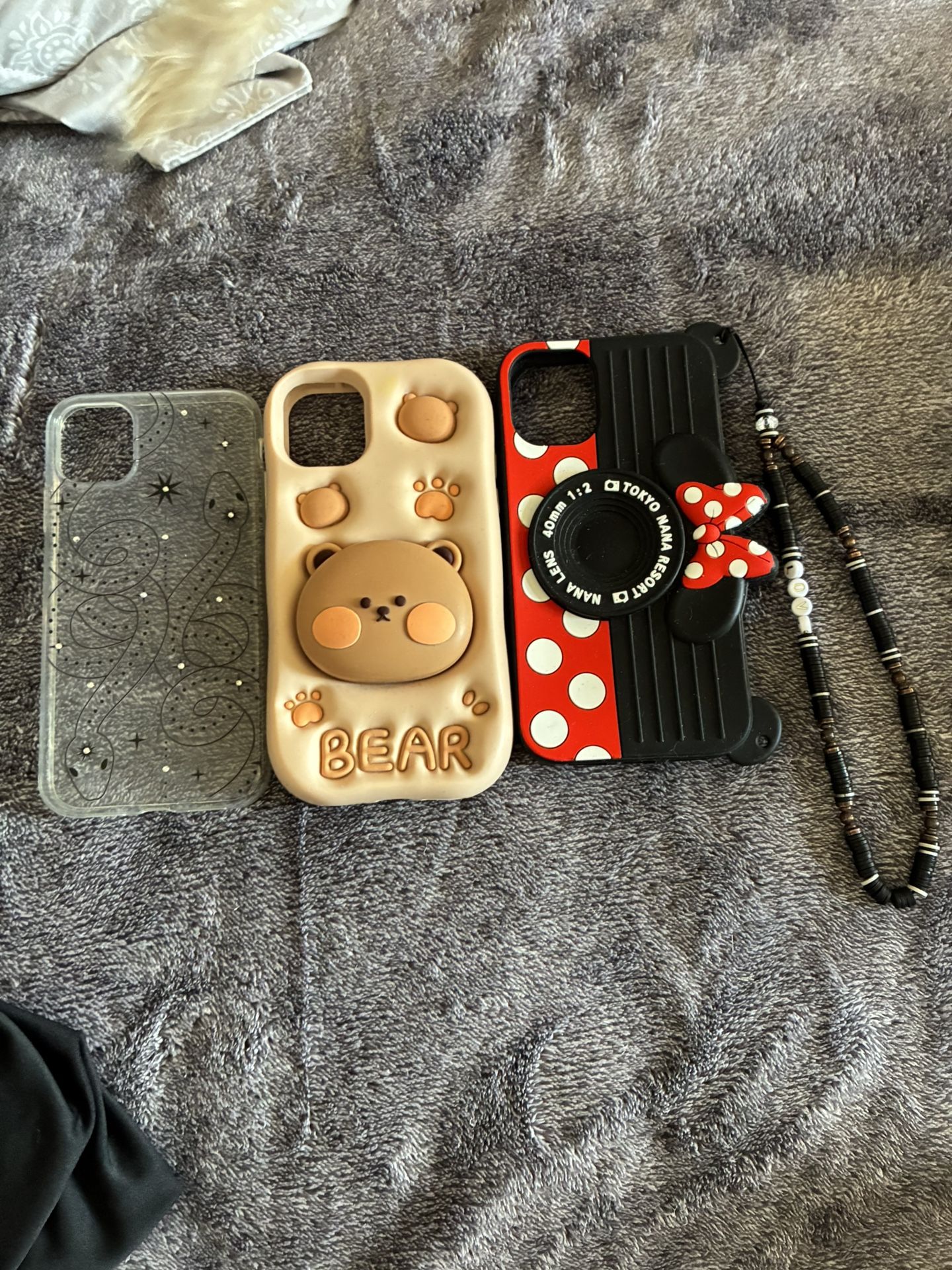 iphone 11 mini mouse case, hello kitty case, and bear case $10 each clear snake case is $5