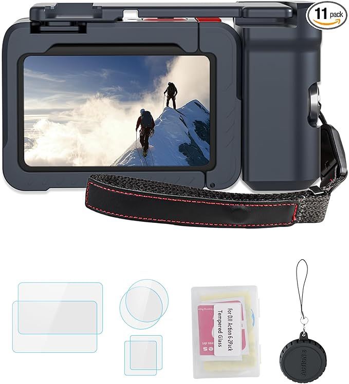 (Camera Grip+Ultra-Light Cage) Protective Metal Frame Action 6 Case with Multiple Expansion Interfaces, 1/4" Screw Hole.. About this item 【Which Action Cameras Compatible with?】Our street girp set is specifically designed for DJI OSMO Action 6, which is engineered to provide customers exceptional shooting experience. Utilizing precision molding technology, perfectly conforms to the camera's curves, leaving no camera ports obstructed.,making it a reliable choice for outdoor adventures, hiking, and sports. 【Made of Aviation-Grade Aluminum】This custom Action 6 camera street handle is crafted from aircraft-grade aluminum using precision CNC technology for exceptional durability and resistance to impact, scratches, and abrasion, which also combines the lightweight and portability of a CCD camera, It is an ideal companion for street selfies, travel vlogs and everyday content creation 【9H Hardness】Longer tempering time for the higher hardness of the tempered glass lens and screen protectors. Protects the DJI Action 6 pro camera screen and lens from high-impact drops, scratches (such as keys and knives), scuffs, and bumps.99.99% High Transparency Crystal clear, no distortion of pixels. Reduces eye fatigue caused by DJI Osmo Action 6 OLED screen or lens, exclusive HD technology creates a perfect visual feast 【Say Goodbye to Traditional Shutter Button】The YETAMKR action camera grip kit eliminates the cumbersome shutter button presses of traditional accessories, making it a standout among professional devices. Its superior shutter design allows for immersive shooting, delivering crisp, instantaneous shutter response with a simple press. Never miss a single moment. 【Multifunctional Action Camera Street Photography】Whether used as a professional street photography device or as a standalone camera cage, the included 1/4-inch screw allows for easy attachment to tripods, gimbals, selfie sticks, or other action camera accessories. The cold shoe mount on the top is compatible with LED lights, microphones, or professional equipment, offering unlimited shooting possibilities 【Easy Battery Replacement without Disassembly】The YETAMKR action 6 aluminum street photography handle set features a magnetic quick release clip mount design, eliminating the need to remove the battery cage or disassemble the camera, making battery replacement effortless and convenient, allowing you to swap batteries between shots and capture fleeting moments 【Ergonomically Designed for Superior Grip】YETAMKR street photography Kit features an ergonomically curved design that naturally conforms to the palm of your hand, effectively distributing grip pressure. The handle is crafted from high-quality, non-slip leather, enhancing the overall feel and minimizing shake for smoother footage