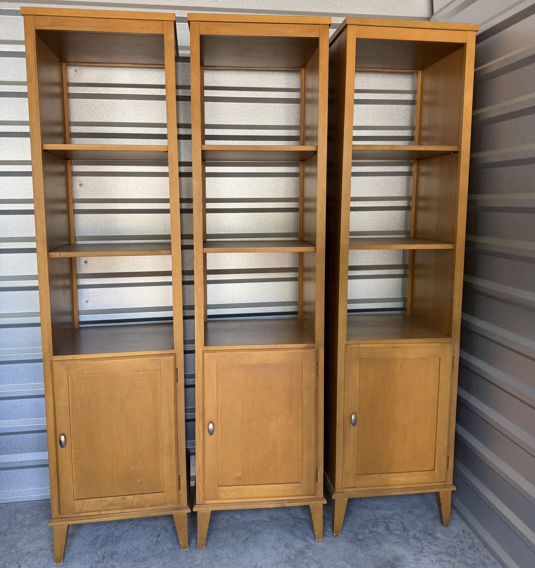 Gorgeous mid-century modern Ethan Allen blonde real wood bookshelves - sold as a set These pieces are 30 years old and they are in pristine condition. Ethan Allen’s timeless design looks amazing in modern time Weil embracing the mid-century modern vibe. Beautiful to display books, decor, vases, T-shirts, artwork, etc. Ample storage underneath behind doors. Heavy. Real wood. Dimensions for each: 73 x 18 x 16 Shelf height: 13 inches. Interior shelf height (behind door): 10 inches