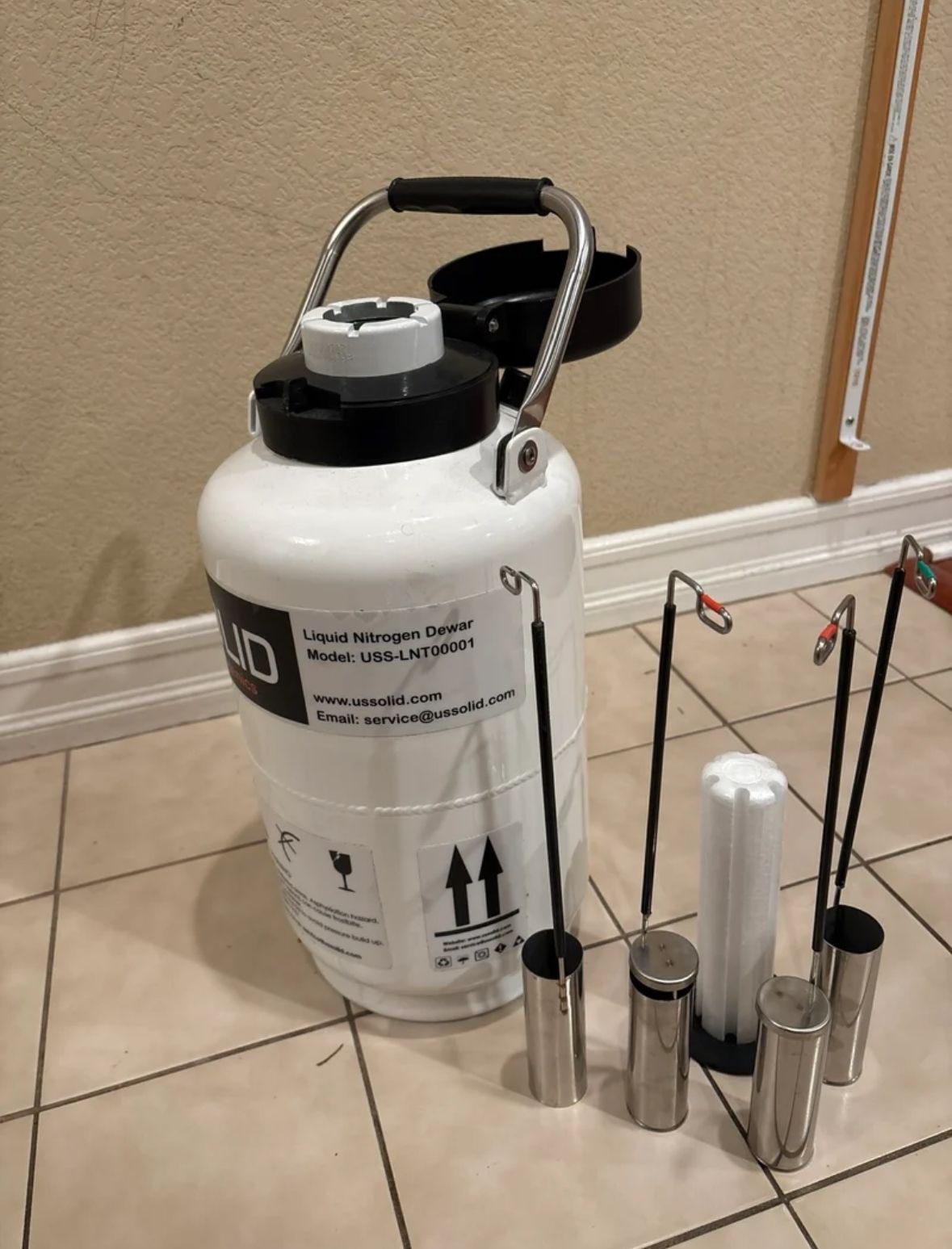 Cryogenic liquid nitrogen (LN₂) dewar tank used for cold storage/transport. Includes the neck plug and the internal canisters/racks shown in the photos (multiple metal canisters + hanger assembly). Great for lab/biotech use, specimen storage, or other cryogenic applications.