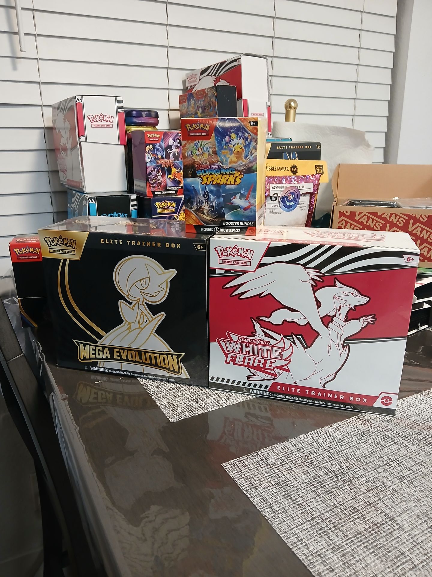 Looking to trade for, (PHANTASMAL FLAMES ) (Ascended heroes) Etbs,& booster bundles (151) -WHITE FLARE ETB -MEGA EVOLUTION ETB -MEGA EVOLUTION SINGLES (10) available From booster box -SURGINING SPARKS booster bundle.