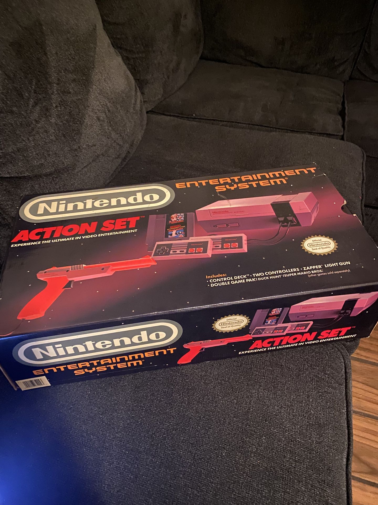 Nintendo entertainment system action set is equipped with control deck two controllers, zapper light gun, and duck hunt/ super Mario bros. Double game pal for unending entertainment for the whole family!! Any retro fan will adore this game system. Only been played a few times everything is brand new even the box is in quality condition!!