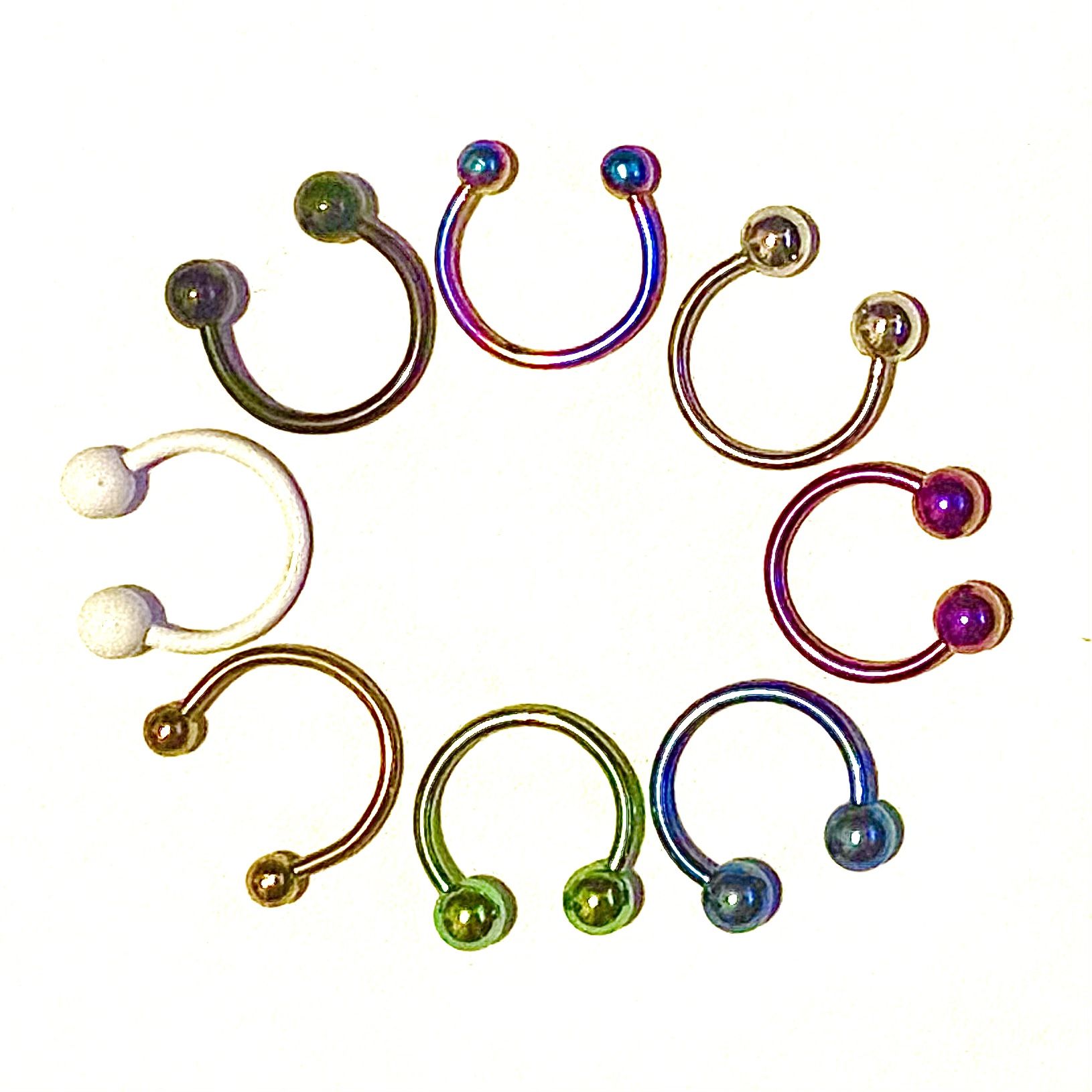 8 Different Colors Brand New (I also have spiked horseshoe styles, captive bead rings, and other sizes (8mm 5/16” and 13mm ½”) for sale, check out my other listings) Black: $3.00 each Rainbow: $4.00 each Silver: $4.00 Blue: $4.00 Gold: $6.50 White: $4.00 Purple: $4.00 Green: $4.00 I’ve priced these to be cheaper than any site on the internet. I can offer a discount when you buy multiple pairs : ) Message me which colors you want and how many, and we can meet up somewhere or I can ship these for you. These are a great deal! Surgical Grade 316L Stainless Steel Titanium Anodized 16 gauge (1.2mm) Captive Bead Ring Jewelry can be used for Nose Septum Cartilage Belly Eyebrow Tragus Lip Ear Lobe Hoop Ring piercings. * Please note that the color may be a little different due to the effect of light.
