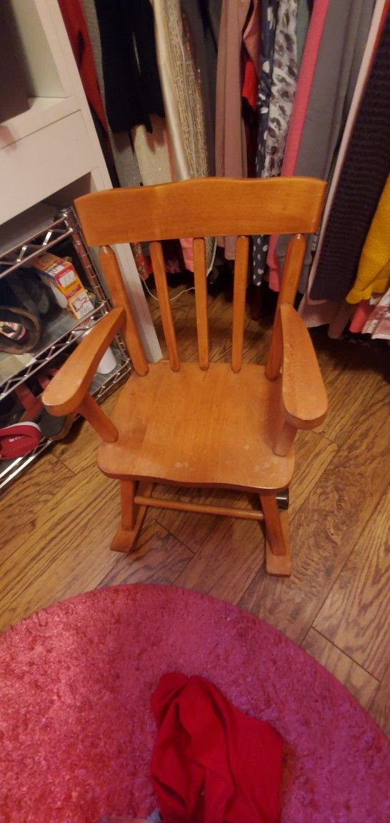 Looks like new. I had this rocking chair refinished many years ago & just had it as a centerpiece in my upstairs. It's a great oak ( I think) child's rocking chair.