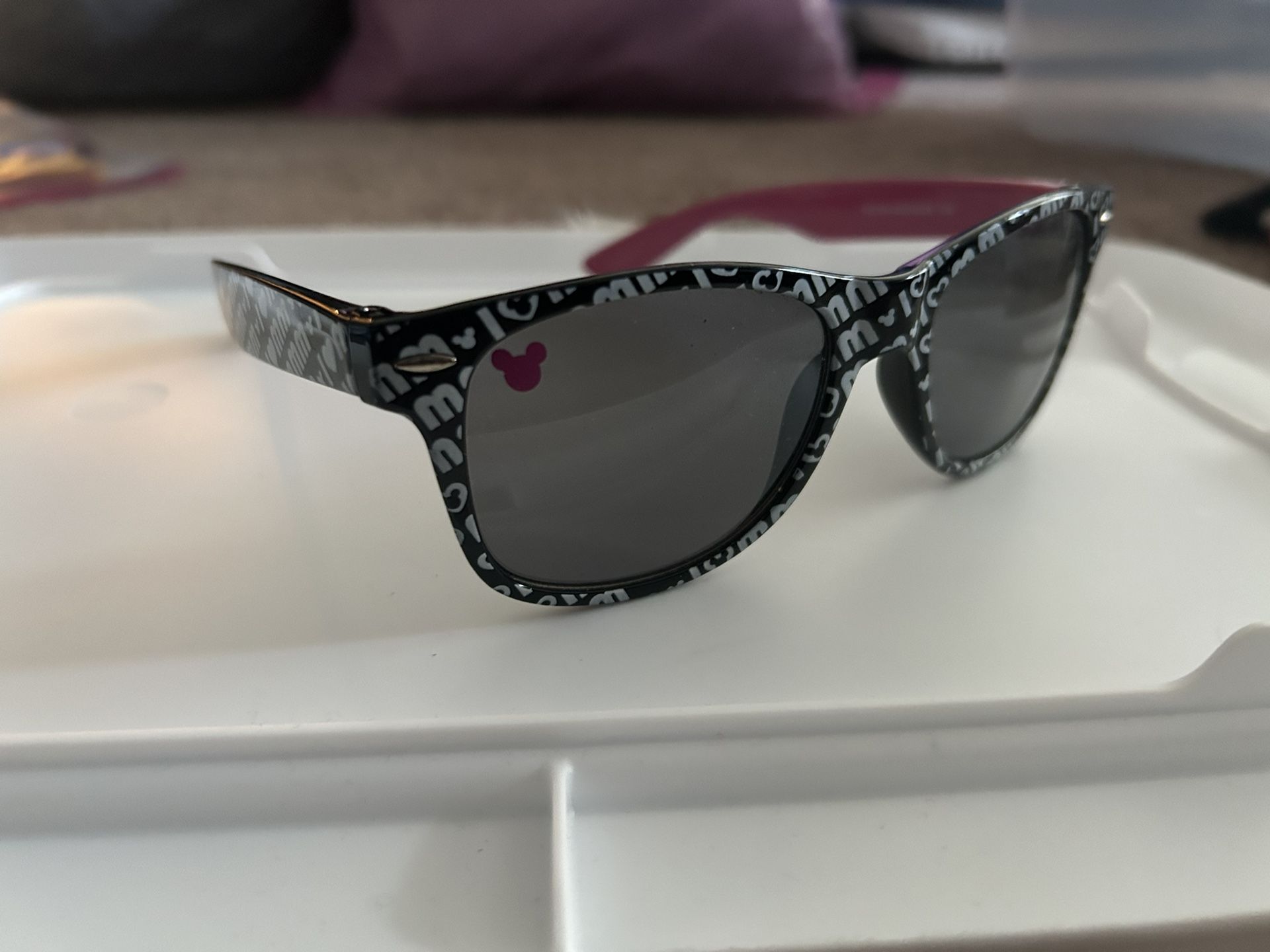Disney brand sunglasses. Slight scratches on lens. Unique small pink Mickey Mouse on corner lens compared to other glasses