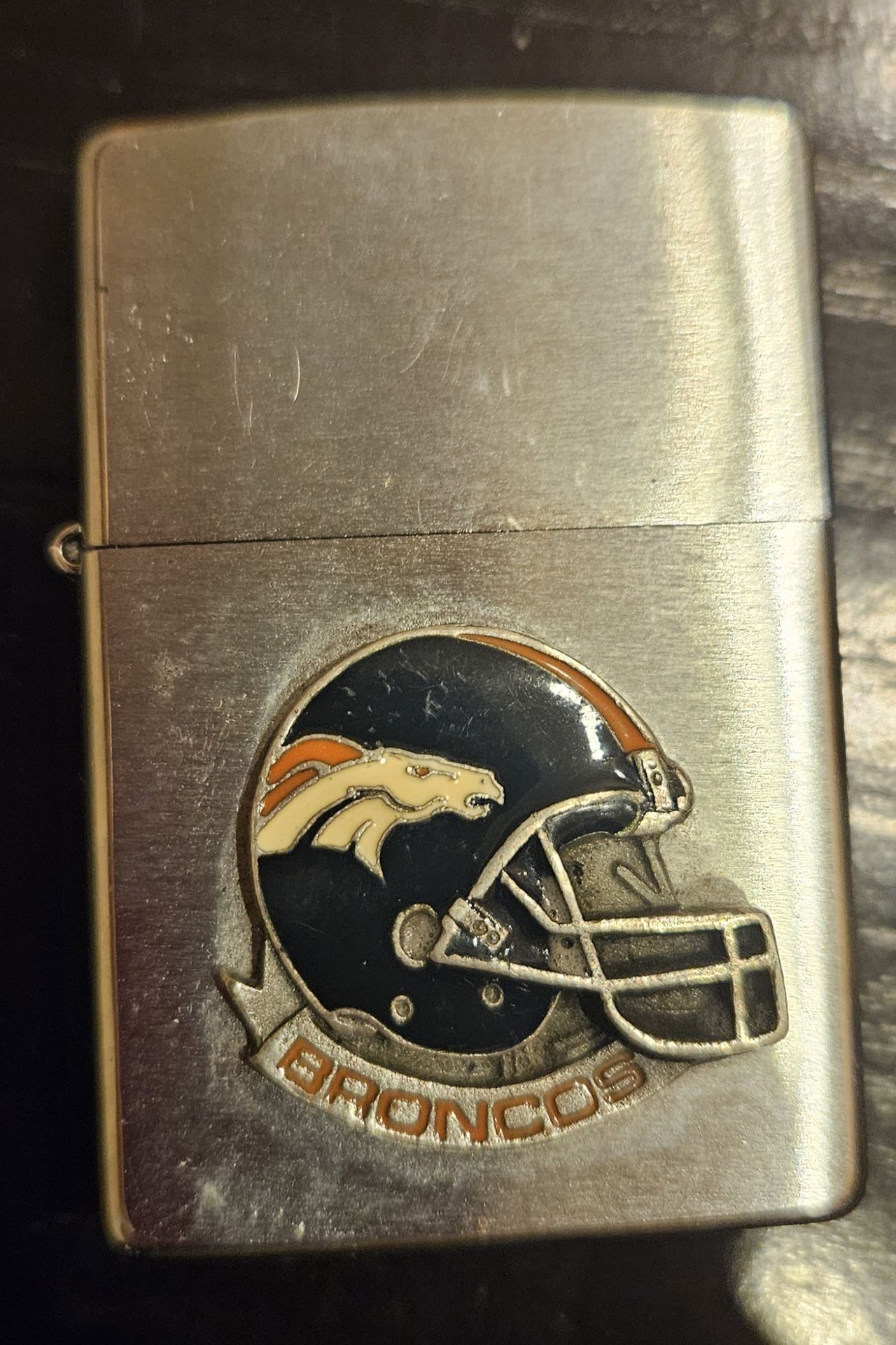 Vintage Zippo NFL Denver Broncos Windproof Lighter, featuring a metal helmet pin badge on a brushed chrome finish. Minor scratches on lighter (needs polishing) and blemishes on case. Never used. Cash pickup in Littleton near Bowles & 470.