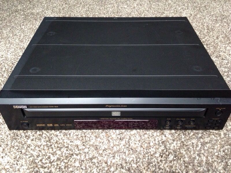 DENON DVM-1835 5-DISC DVD CHANGER W/REMOTE - NEW CONDITION - SERVICED & TESTED at NorthWest Audio ** CASH ONLY - Make an Offer Denon's DVM-1835 combines high-quality audio and video performance with five-disc convenience. This changer delivers crisp, vivid pictures from all of your movies, concerts, and TV show box sets on DVD. Load it up with a selection of films by your favorite director for a fun Saturday evening marathon. The '1835 also does a great job with music. It can play regular CDs, as well as MP3 and WMA (Windows® Media Audio) mix discs. Connect this changer to a home theater receiver and experience your movies and music in engaging surround sound. Features selectable progressive-scan playback for smoother video with HD-compatible TVs (via the component video output) Virtual Surround Sound for enhanced 2-speaker sound optical and coaxial digital outputs for Dolby® Digital/DTS®/PCM audio/video output (composite, S-video, and 480i/480p component video) plays DVD-Video, and DVD-R & DVD-RW plays CD, CD-R & CD-RW, and MP3 and WMA CD-R & CD-RW plays digital picture CDs (JPEG, Kodak, and Fuji) remote control 54MHz/12-bit video digital-to-analog converter 192kHz/24-bit audio digital-to-analog converter audio signal-to-noise ratio 115 dB 17-1/8"W x 4-1/16"H x 15-5/8"D