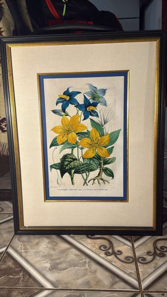 Framed Botanical Painting of Blue and Yellow Flowers 22x28