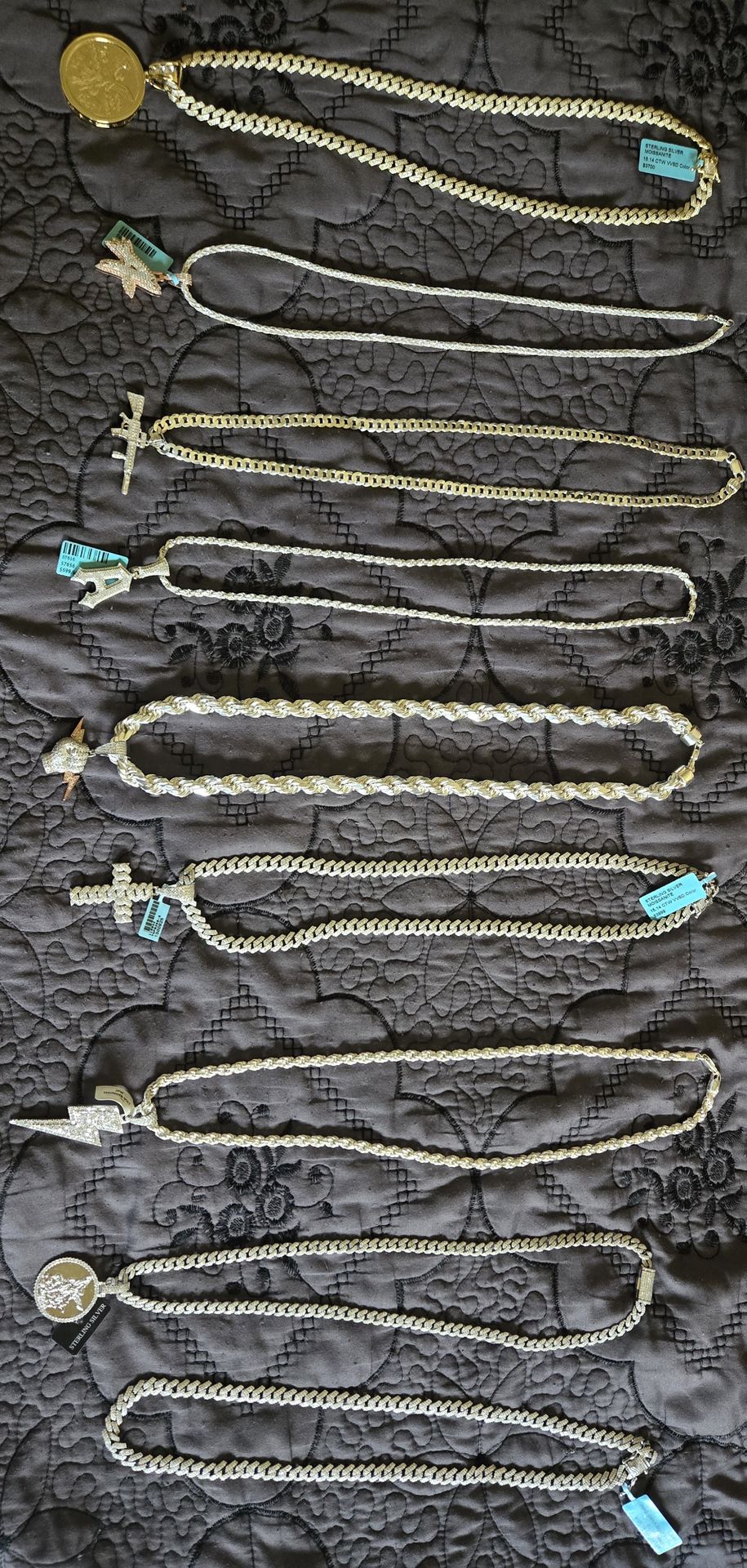 SOLID SILVER CHAINS REAL MOISSANITE STONES CHAIN & PENDANT COMBO DEALS CHAINS CAN BE SOLD SEPARATELY PENDANT CAN BE SOLD SEPARATELY REAL SILVER NOT PLATED MESSAGE ME WHICH ITEM YOUR INTERESTED IN FOR PRICING Brand New, never worn .925 Sterling Silver Italian Made STAMPED 925 ITALY & Moissanit Authentic Real Silver, Not plated or dipped Original Pick up only The Price of Silver Is Rising Everyday! El precio de plata sigue suviendo cada dia! I have different style chains, bracelets and sizes, check out my posts for more Perfect gift for the Holidays Se Habla Español Nueva nunca usada Auténtica 100 por ciento Plata No es plateada o sumergido en plata Tengo diferente estilos y medidas, revise mi publicación Tags: Christmas, Birthday, Anniversary, Gift, New Year, Celebration Regalo de navidad, cumpleaños, aniversario, regalo, celebracion, nuevo año