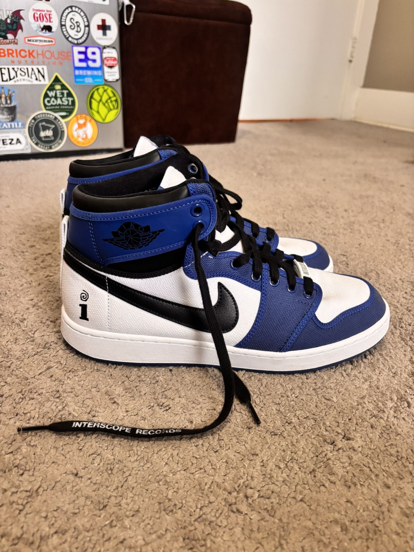 Were my dads. He wore them once, MAYBE twice. Why the price is where it’s at. Practically brand new out the box. These are a special collab version of the Air Jordan 1 Mid SE “Sisterhood”. On this release, the classic “Air Jordan” Wings logo is stylized to read “AIKO.” Not fully sure what the “Interscope Records” is