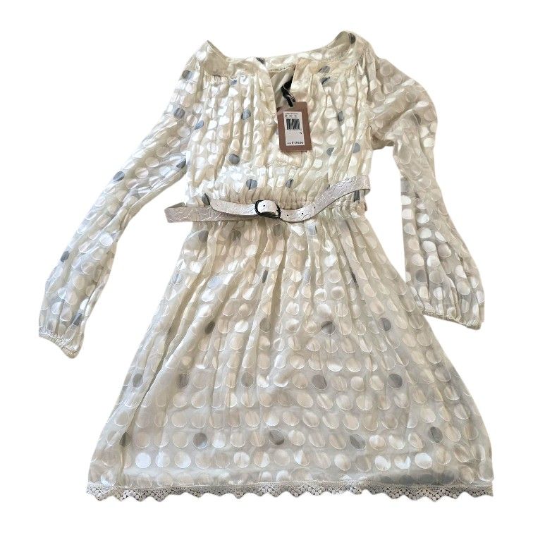 New with tags Chelsea & Violet dress size S Measures approximately 15" pit to pit (flat) 30" shoulder to hem Pleated long-sleeve off-white pattern of light gray and white circles matching white belt scalloped, lace-like trim