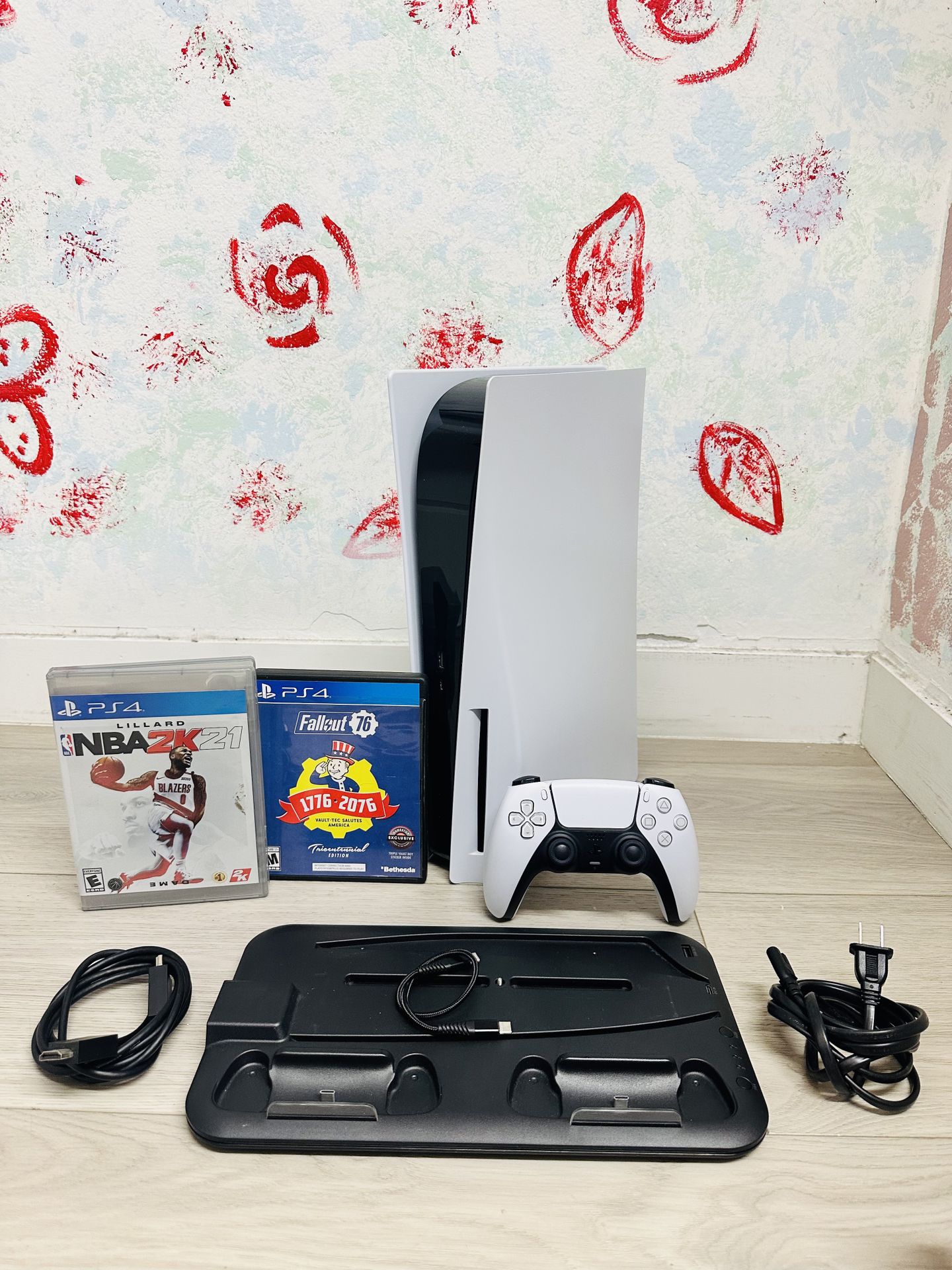 My Product Used , Very New 1 PlayStation 5 1 Controller 1 Power Cable 1 HDMI Cable Bonus 1 Game NBA 2K21 Lillard 1 Game Fallout 76 1 Charger Station