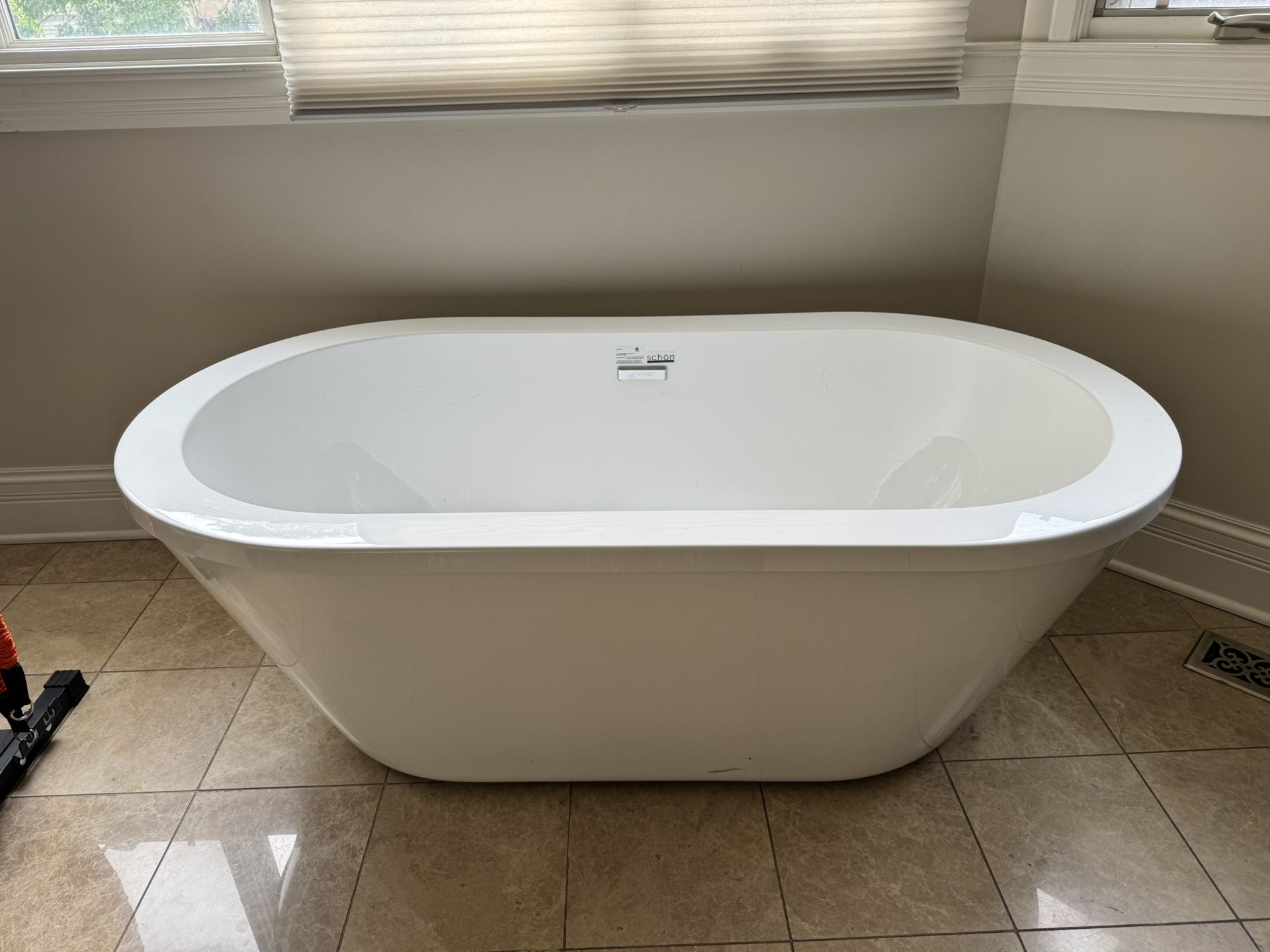 Used for display only. Schon free standing beautiful bathtub 22 inches tall 63 inches length 33 inches wide