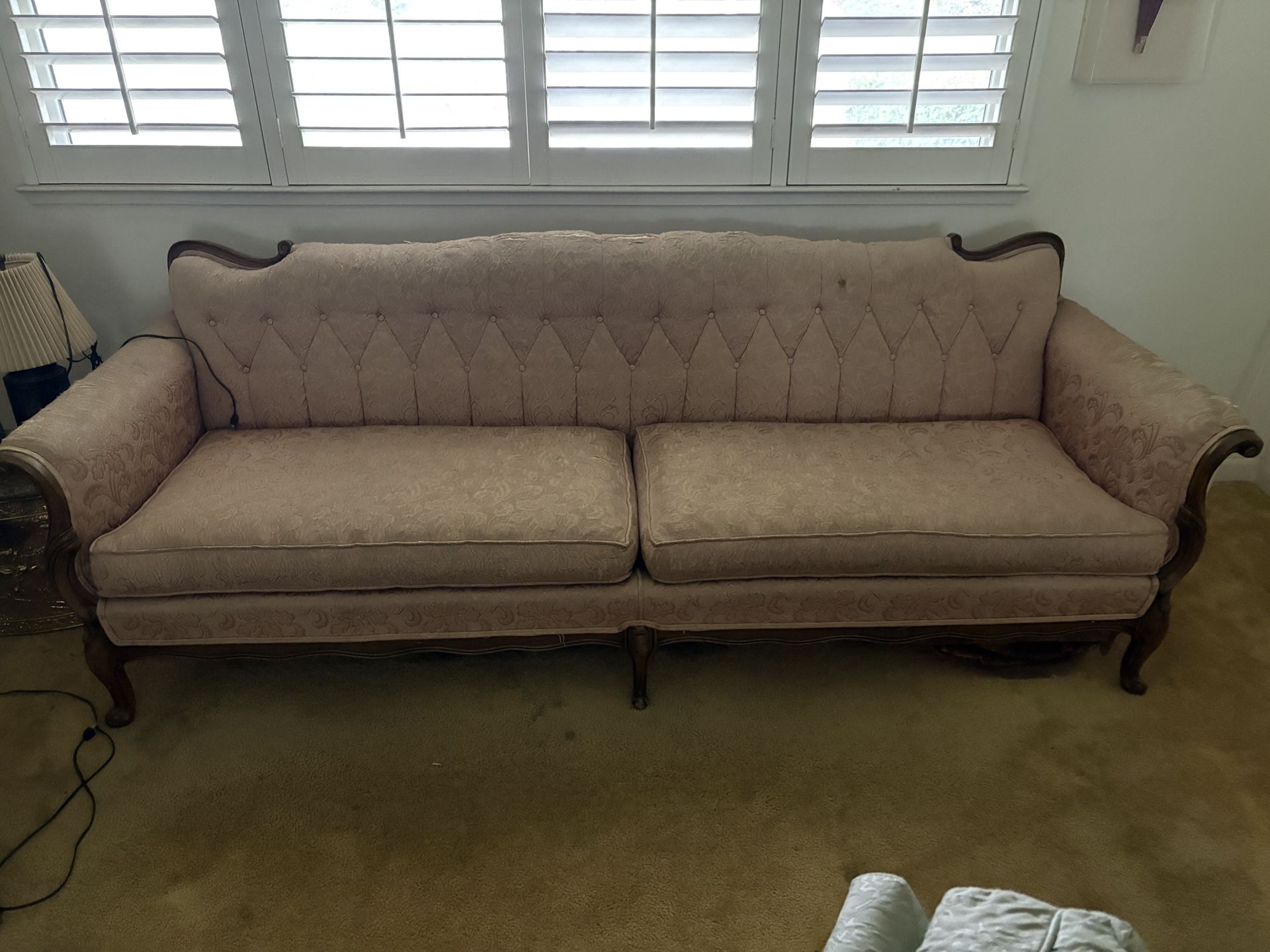 French Provincial sofa with a tufted back and pink damask upholstery.
